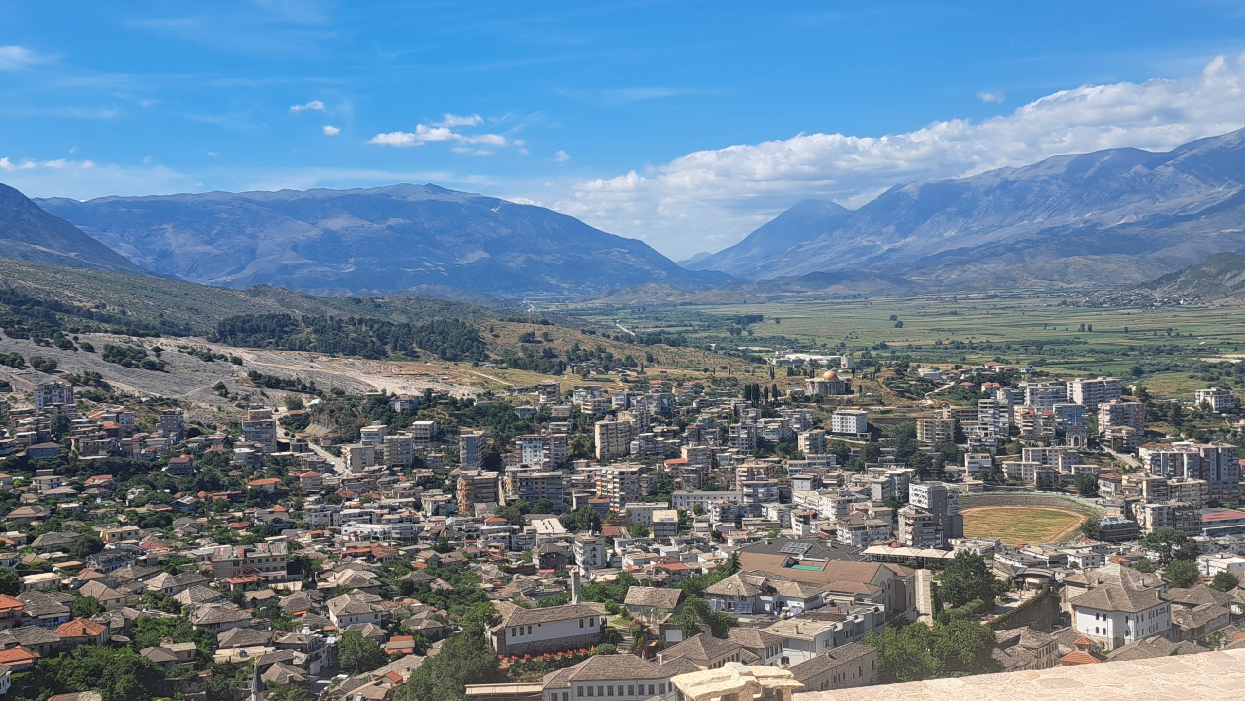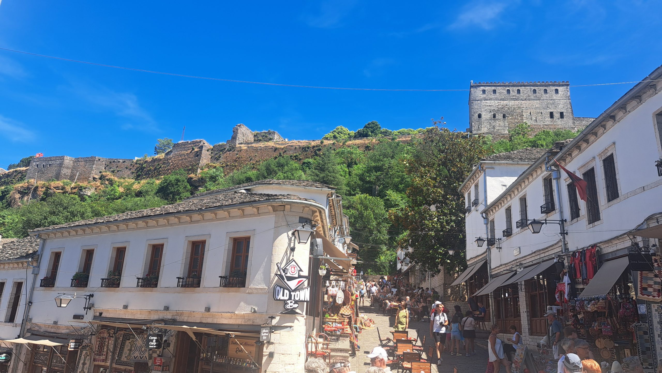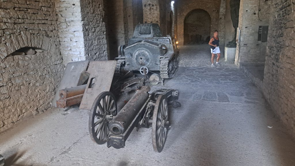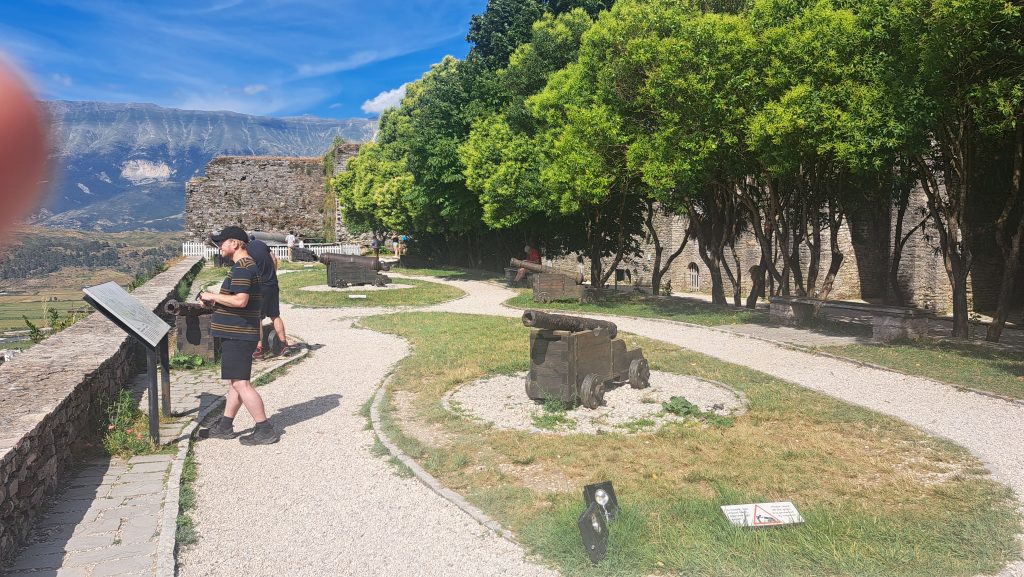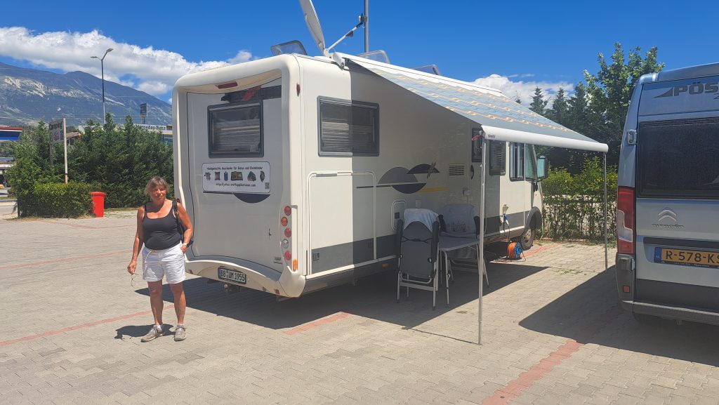 Gegen 11:30 erreichen wir den Campingplatz Gjirokastra. Jutta entschließt sich: heute ist Waschtag. Gegen 14 Uhr machen wir uns auf den Weg in die Stadt und auf die Burg, die auch von Ali Pascha erbaut wurde. Es ist eine große, weitläufige Burg, die genauso nüchtern ausgestattet ist, wie die kleinere in Palermo. Wir treffen hier ein kleines Fernsehteam von der ARD, die einen Reisebericht über Albanien drehen und haben ein sehr interessantes Gespräch mit den jungen Leuten. Auf dem Rückweg zum WoMo essen wir in der Stad noch ein traditionelles Abendessen.