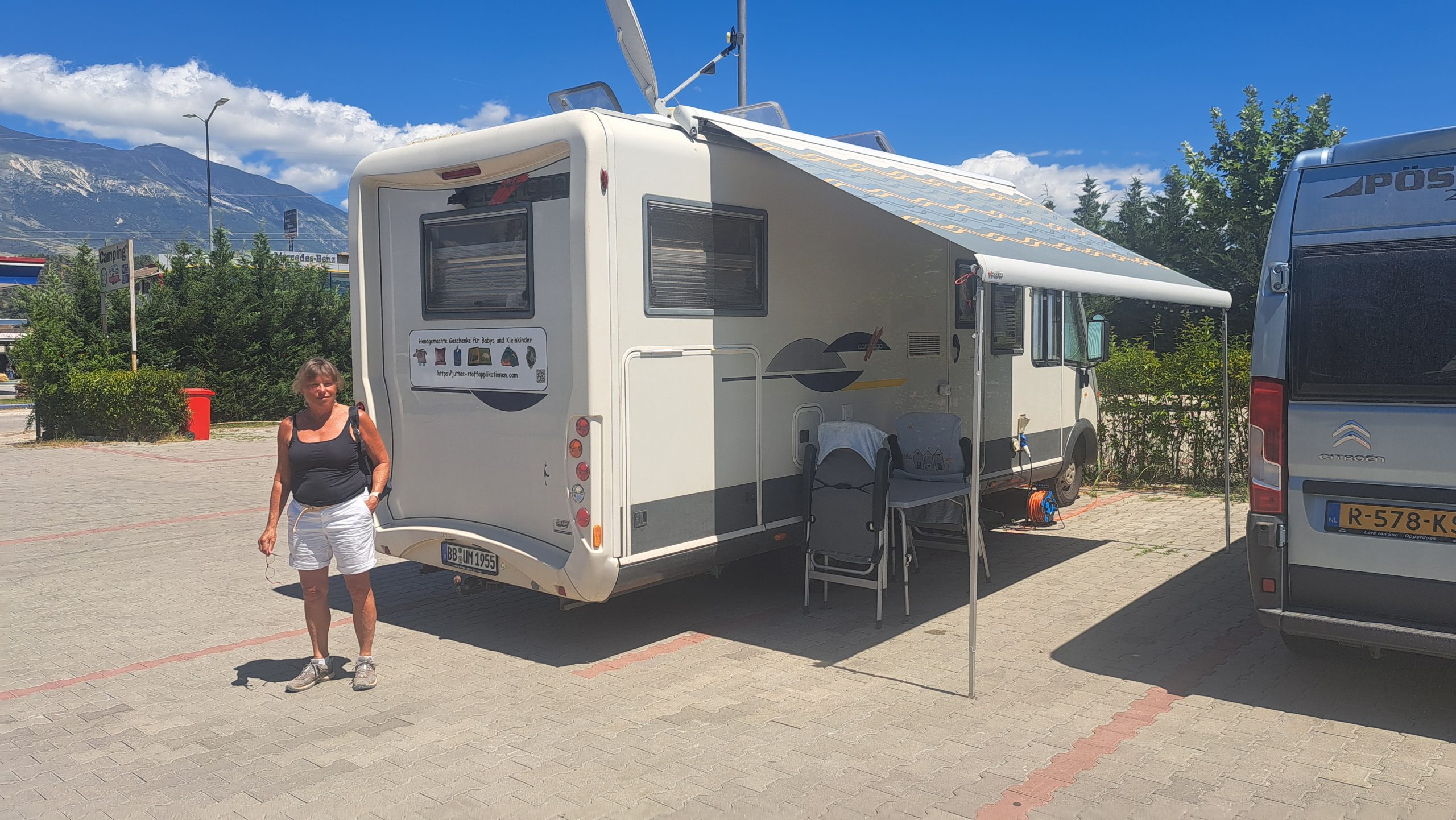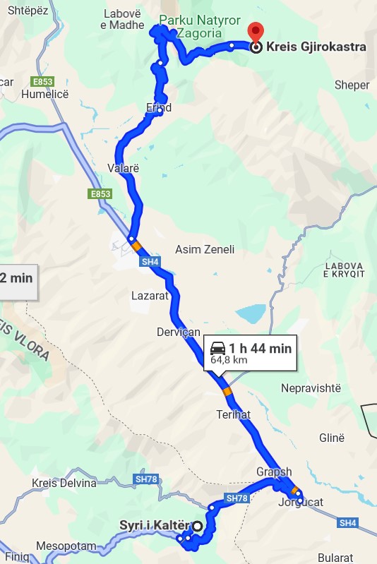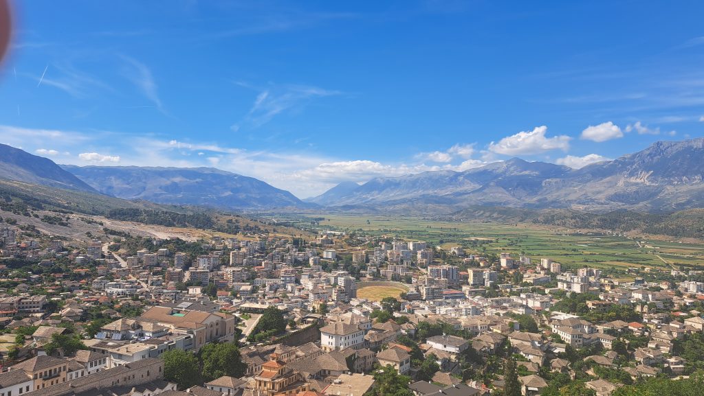 Nach dem Frühstück fahren wir weiter in Richtung Süden. Unser heutiges Ziel ist Gjirokastra. Die Verkehrszeichen an einem der ersten Kreisverkehre widerspricht unserem Navi. Wir glauben dem Schild und werden in die Irre geführt…als wir es merken folgen wir wieder CoPilot GPS. Allerdings leitet uns das Navi diesmal auf einen Feldweg mit riesigen Löchern und kleineren Felsbrocken… das WoMo muss leiden!