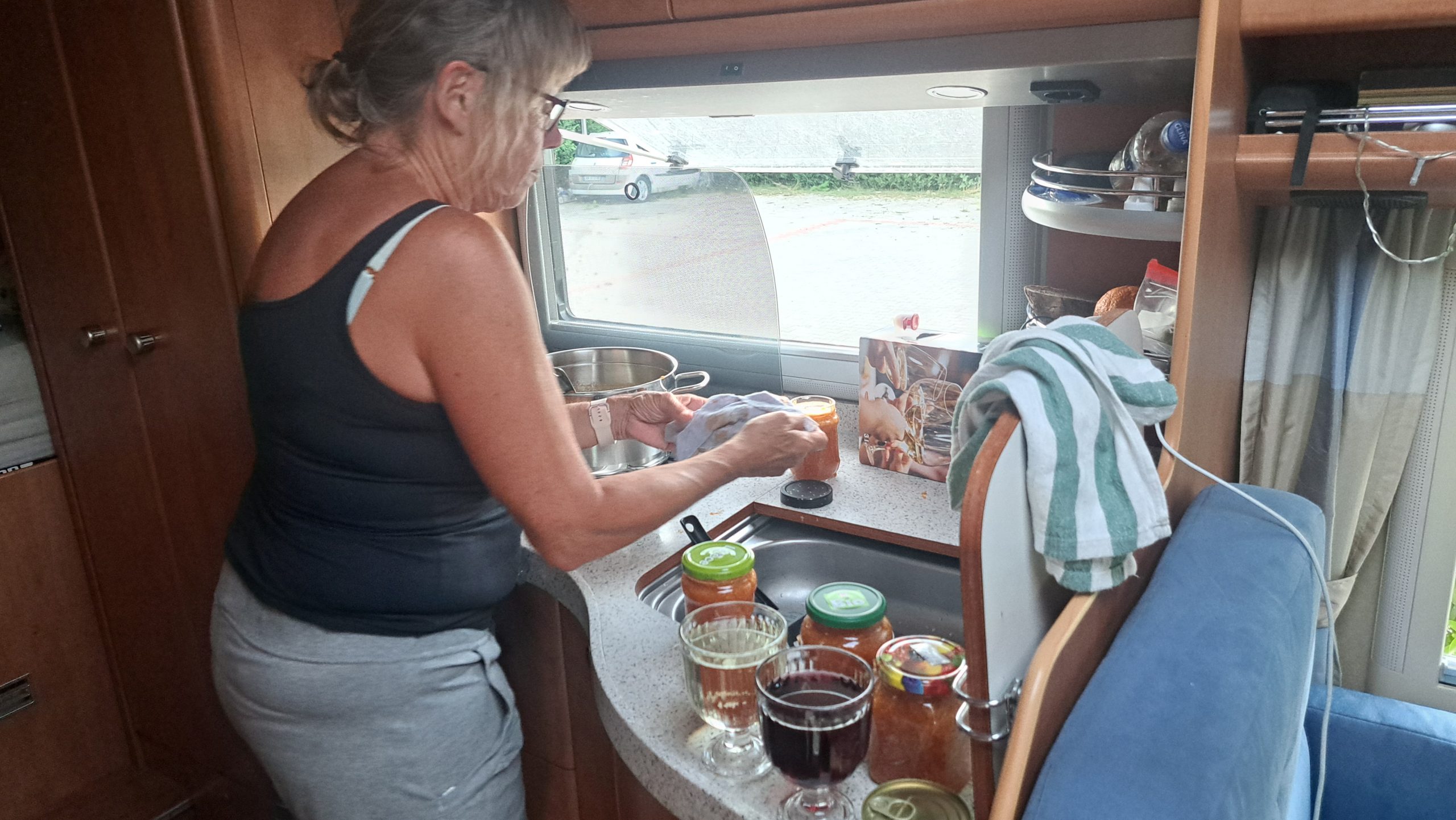 Im WoMo angekommen kocht Jutta aus den Aprikosen, die wir unterwegs gekauft haben Marmelade. Am Abend schauen wir dann im WoMo das grandiose EM Auftaktspiel der deutschen Fußballmannschaft gegen Schottland an… das wird feucht: pro Tor, das einer Deutscher schießt, gibt es einen Schnaps!