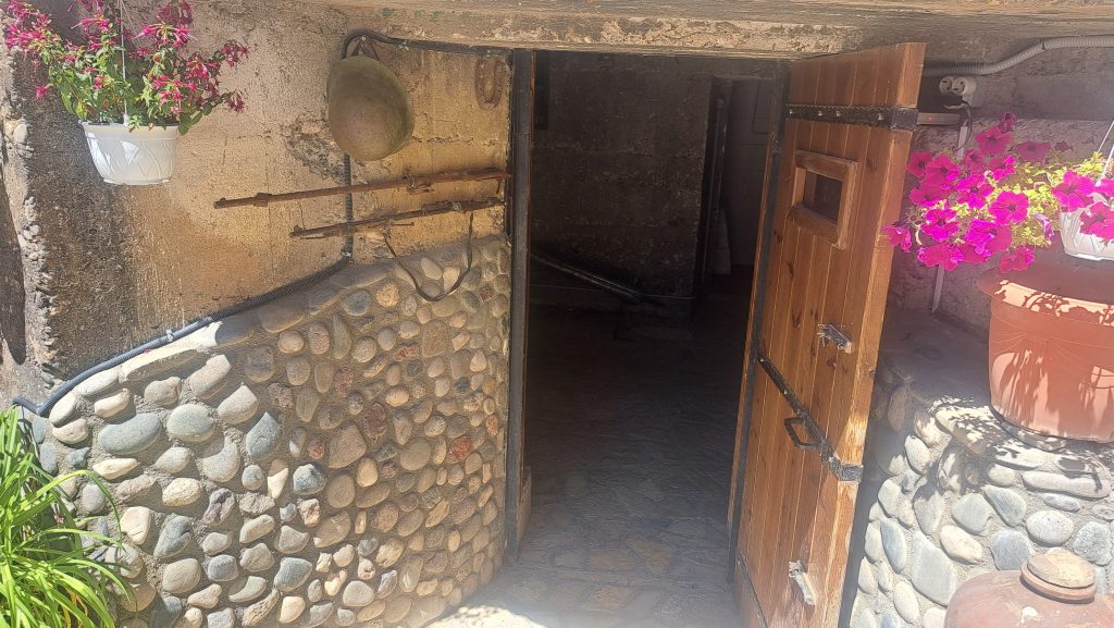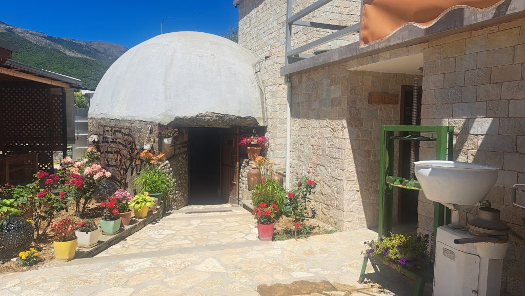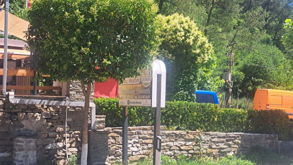 Unser Reiseführer weist darauf hin, dass vor Perment eine Käserei existiert, in die eine Einkehr lohnt. Wir fahren also los. Die  SH75 ist, wie meist in Albanien, gut zu erfahren. Dennoch erfordern die teils tiefen Schlaglöcher und die ‚Bumps’zur Reduzierung der Geschwindigkeit volle Aufmerksamkeit beim Fahren. Plötzlich meint Jutta ‚da, links, ist die ‘Baxo Meshini Bunkeri‘. Ich halte an, und wir gehen in den Innenhof der Käserei. Tatsächlich steht dort ein kleiner Bunker, in den wir hineinschauen können.  Ob dort aktuell noch Käse produziert wird lässt sich nicht erkennen.  In dem dazugehörigen Laden probieren wir Schafskäse und kaufen zwei Stück. Voller Stolz zeigt uns der Besitzer auf seinem Handy eine ZDF Reportage, in der seine Käserei gezeigt wird.