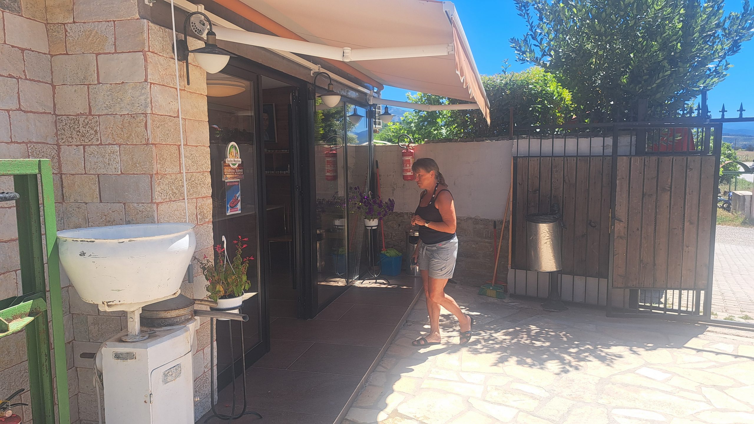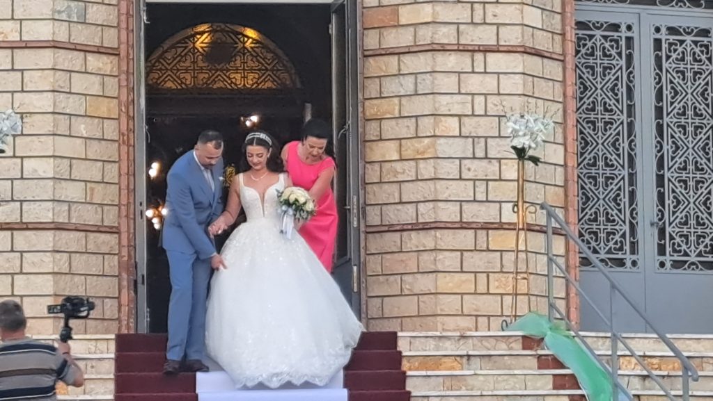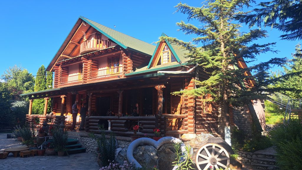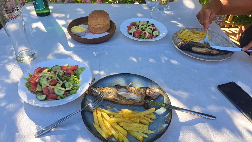 Nach dem Bad geht es mit dem WoMo zurück zur SH75 um weiter nach Korca zu fahren. Laut Reiseführer wäre die Straße schlecht zu befahren und nur rudimentär asphaltiert…es war nicht so schlimm. Zu Anfang ist die Straße eng, kurvenreich und es gibt auch Schlaglöcher. Doch dann: eine komplett neu geleert Straße,  wunderbar zu befahren.  Auf halber Strecke nach Korca entdecken wir auf der rechten Seite ein Restaurant mit Biergarten.  Wir entschließen uns anzuhalten und eine Pause zu machen…allerdings ist der Parkplatz voller Autos. Der Restaurantbesitzer kommt zu uns und weist uns den Weg auf den neben dem Restaurant gelegenen Campingplatz. Dort dürfen wir parken. Auf dem Weg zum Restaurant hören wir laute albanischen Live-Musik. Wir werfen einen Blick in das Lokal und werden sofort aufgefordert mitzutanzen. Es ist eine Hochzeitsfeier! Wir folgen der Aufforderung und geben unser Bestes. Nach zwei Runden klinken wir uns aus, setzen uns an einen Tisch außerhalb der Gaststube und bestellen unser Essen.