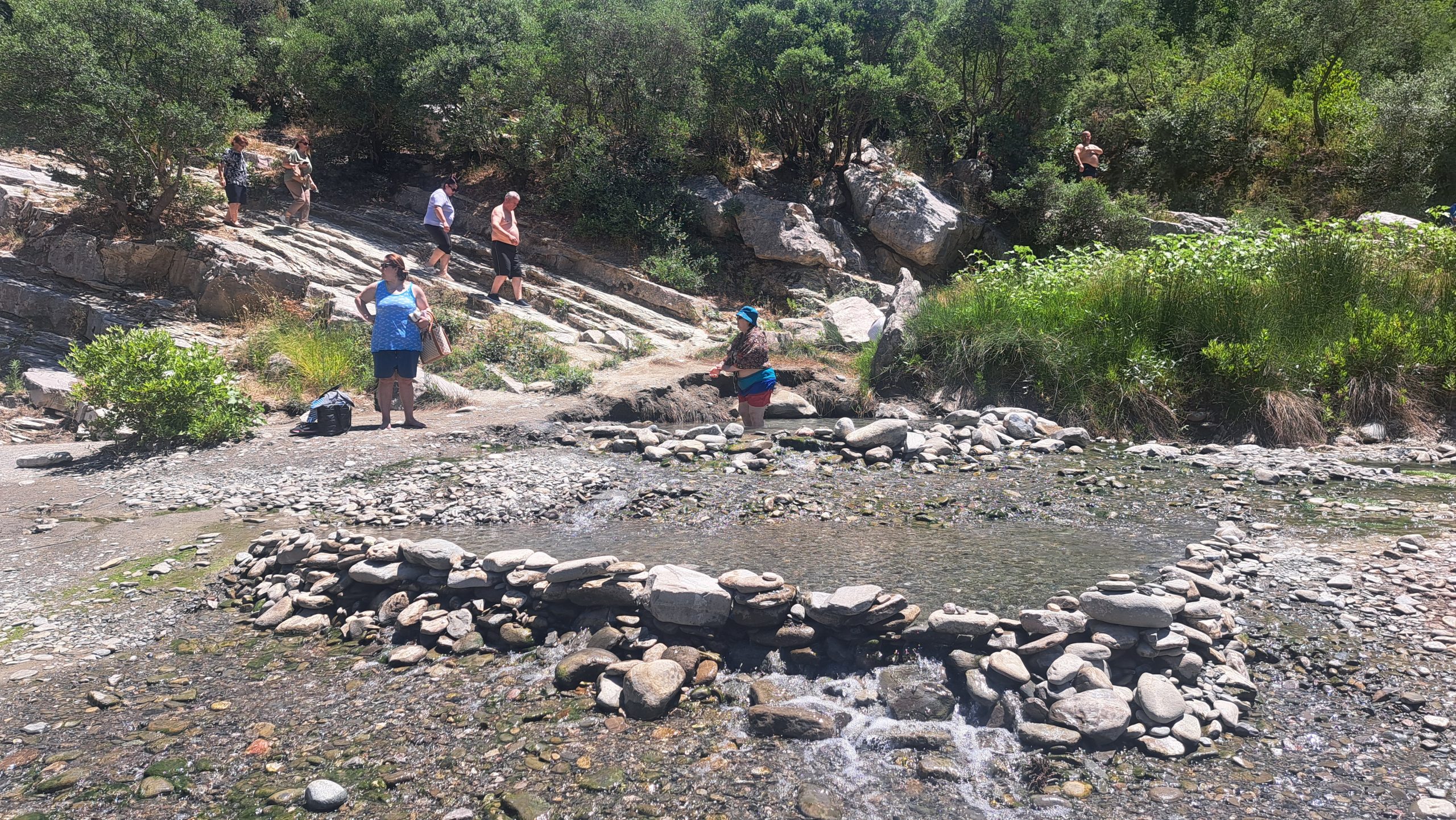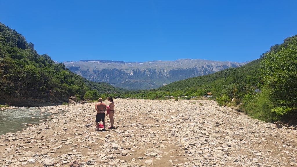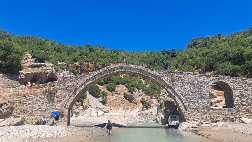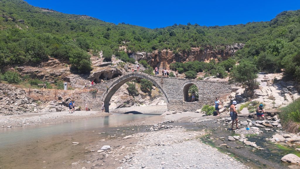 Wir fahren weiter. Es gibt auf dem Weg nach Korca noch ein Highlight, das wir besuchen wollen: die Thermalbecken in dem Lengaricia Canyon. Von der SH75 führt bei Petrant links eine schmale, aber auch für WoMos gut befahrbar Straße in Richtung Canyon. Nur die letzten Meter auf dem Parkplatz sind anstrengend für das WoMo. Ein Aufsetzen mit der Anhängerkupplung ist bei den großen Löchern nicht zu vermeiden. Wir stellen das WoMo ab und gehen auf die im Reiseführer beschriebene alte Steinbrücke, die über den Fluss Lengaricia führt, zu. Nun sehen wir auch die Thermalbecken, in den sich einige Leute tummeln. Wir entschließen uns in das große Becken zu gehen.  Erwartet haben wir dort Thermalbadtemperaturen von 36 oder mehr Grad Celsius. Uns kam es kälter vor.