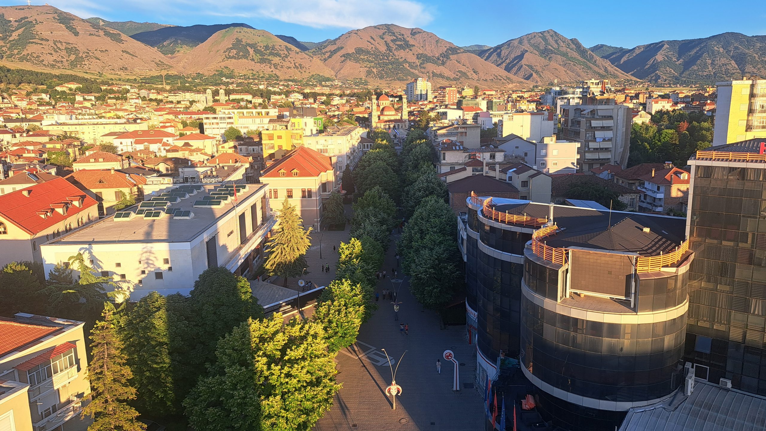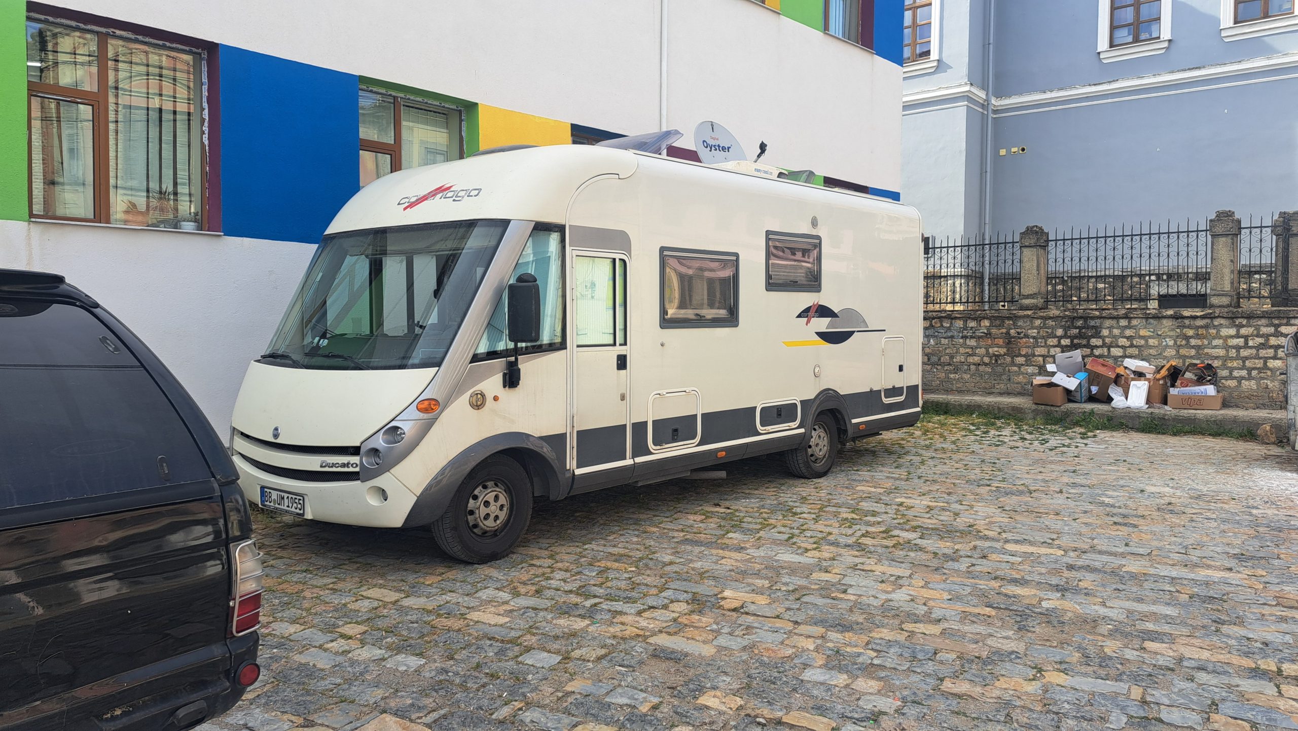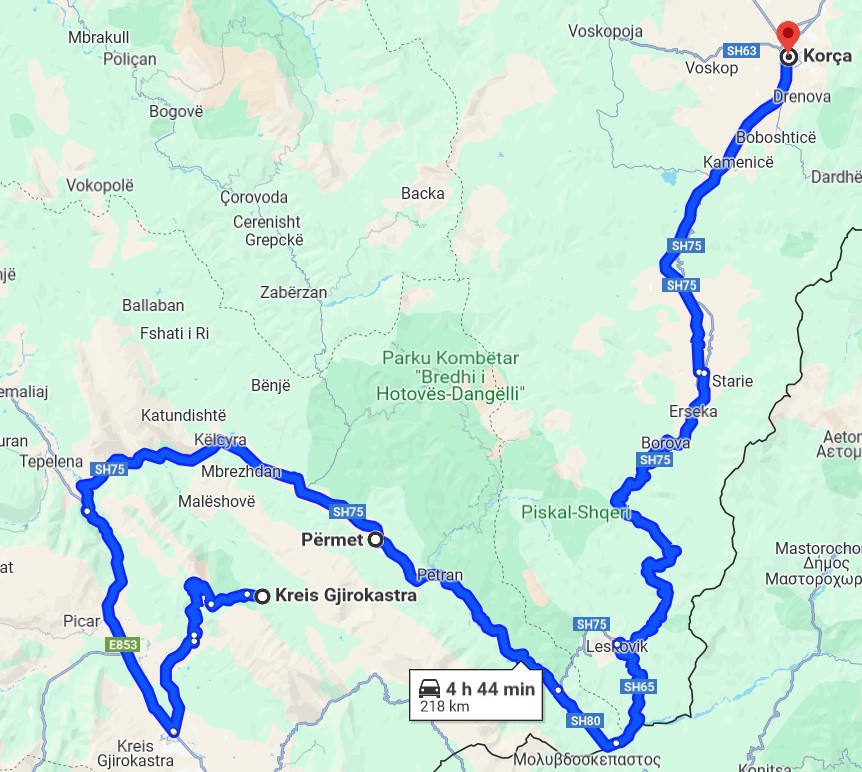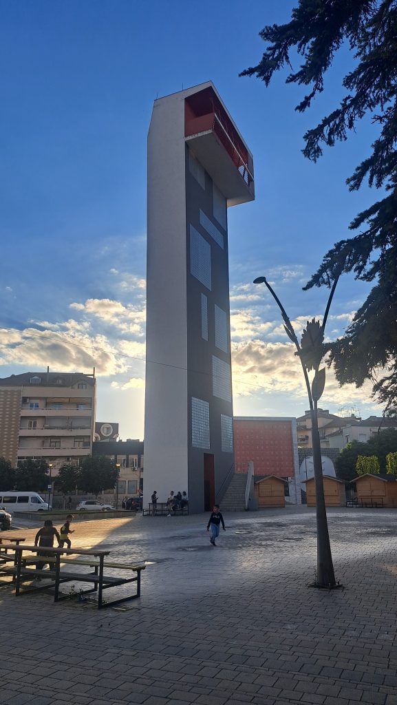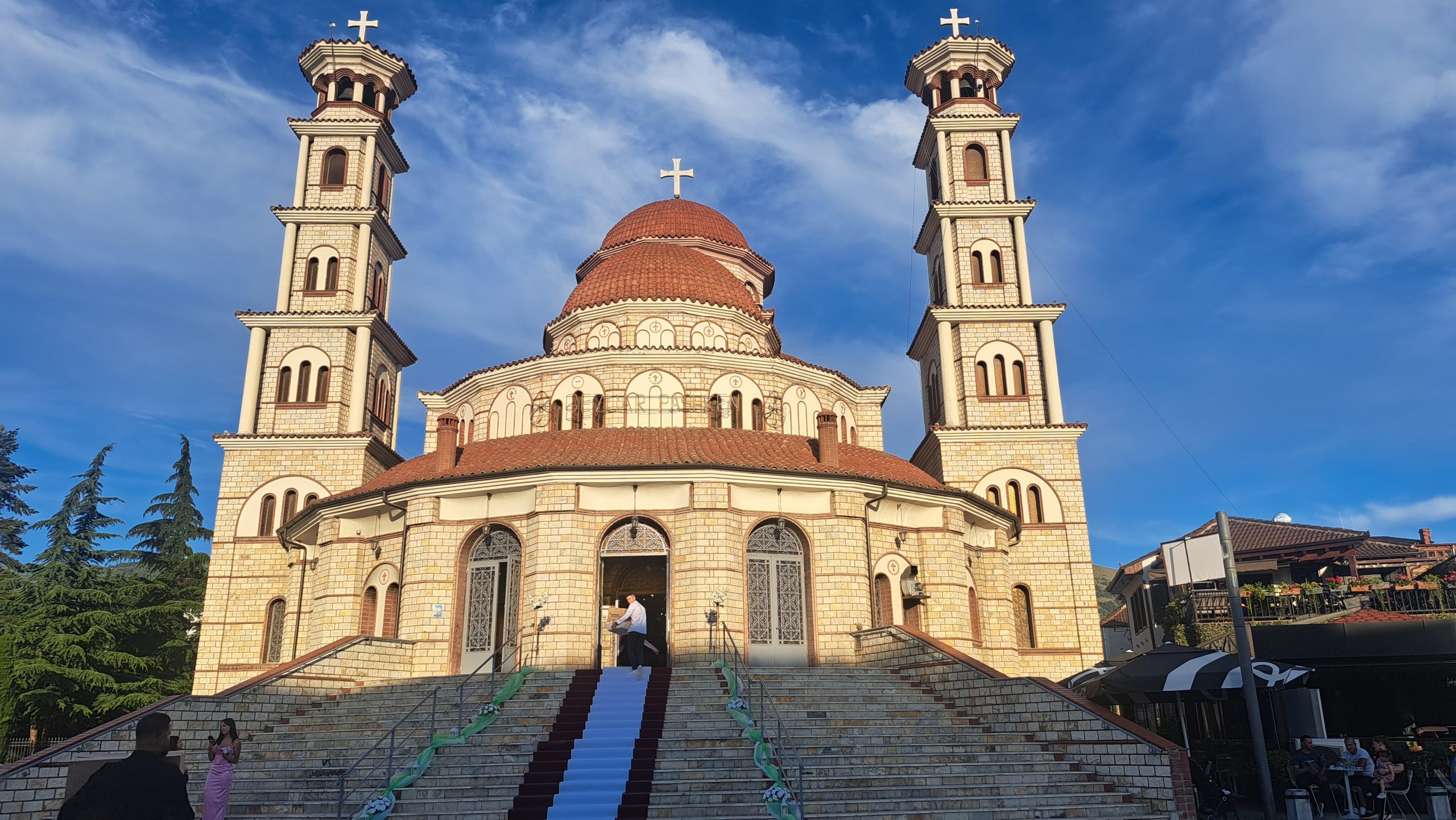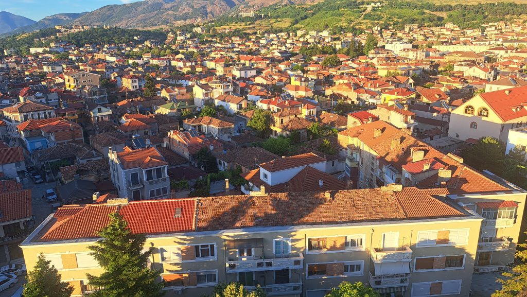 Nun geht es wieder zurück zum WoMo und unserem finalen Ziel Korca entgegen.  Über Park4Night habe ich einen Stellplatz neben einer Schule in der Innenstadt ausgesucht. Von hier aus machen wir uns zu Fuß auf den Weg in das Zentrum. Über den Platz der Republik gelangen wir zur Kathedrale im Zuckerbäckerstil, die auch der Bischofssitz ist, und weiter in die Fußgängerzone. Hier schlendern wir entlang der Geschäfte und der vielen Restaurants,  die sich auf das EM Spiel Albanien-Italien vorbereiten. Bevor wir zurück gehen, besuchen wir den Aussichtsturm der Stadt. Von hier oben bietet sich ein Rundumblick über Korca. Dann geht es zurück in Richtung  WoMo. Kurz vor der Schule haben wir ein Restaurant ausgemacht,  in dem im Biergarten ein Fernseher aufgestellt wurde, um das Albanien Spiel zu zeigen. Wir kehren ein, trinken einiges und hoffen mit den Albaniern auf einen Sieg gegen Italien….daraus wird leider nichts. Nach dem Spiel kehren wir zurück ins WoMo. Die Nacht war recht ruhig….bis dann am Sonntagmorgen um 7 Uhr die Müllabfuhr kommt um die Eimer neben unserem Wohnmobil zu lehren. Schlafen war vorbei. Ich gehe zum Bäcker um die Ecke und kaufe für 50 Cent ein Brot. Dann wird gefrühstückt, noch ein kleiner Bummel in die nähere Umgebung gemacht und dann geht es weiter.