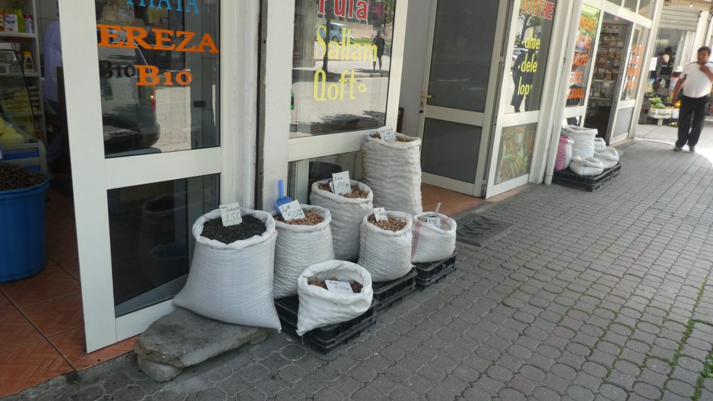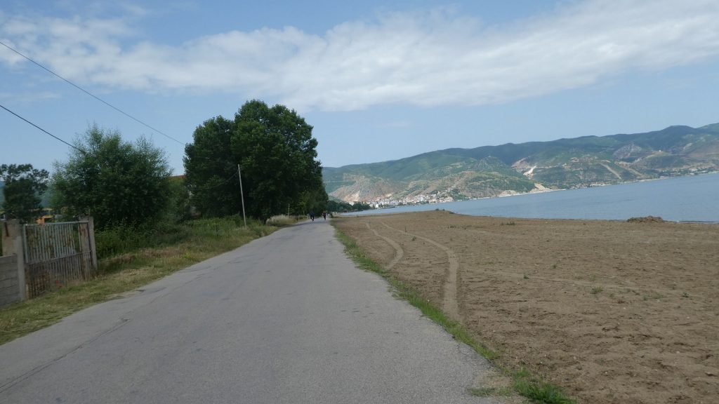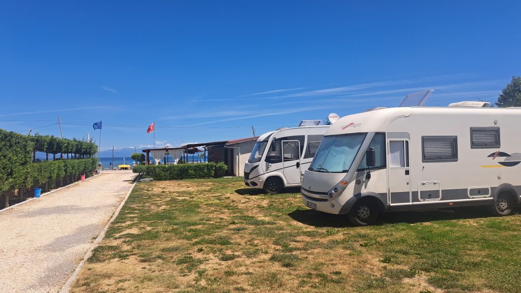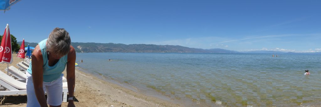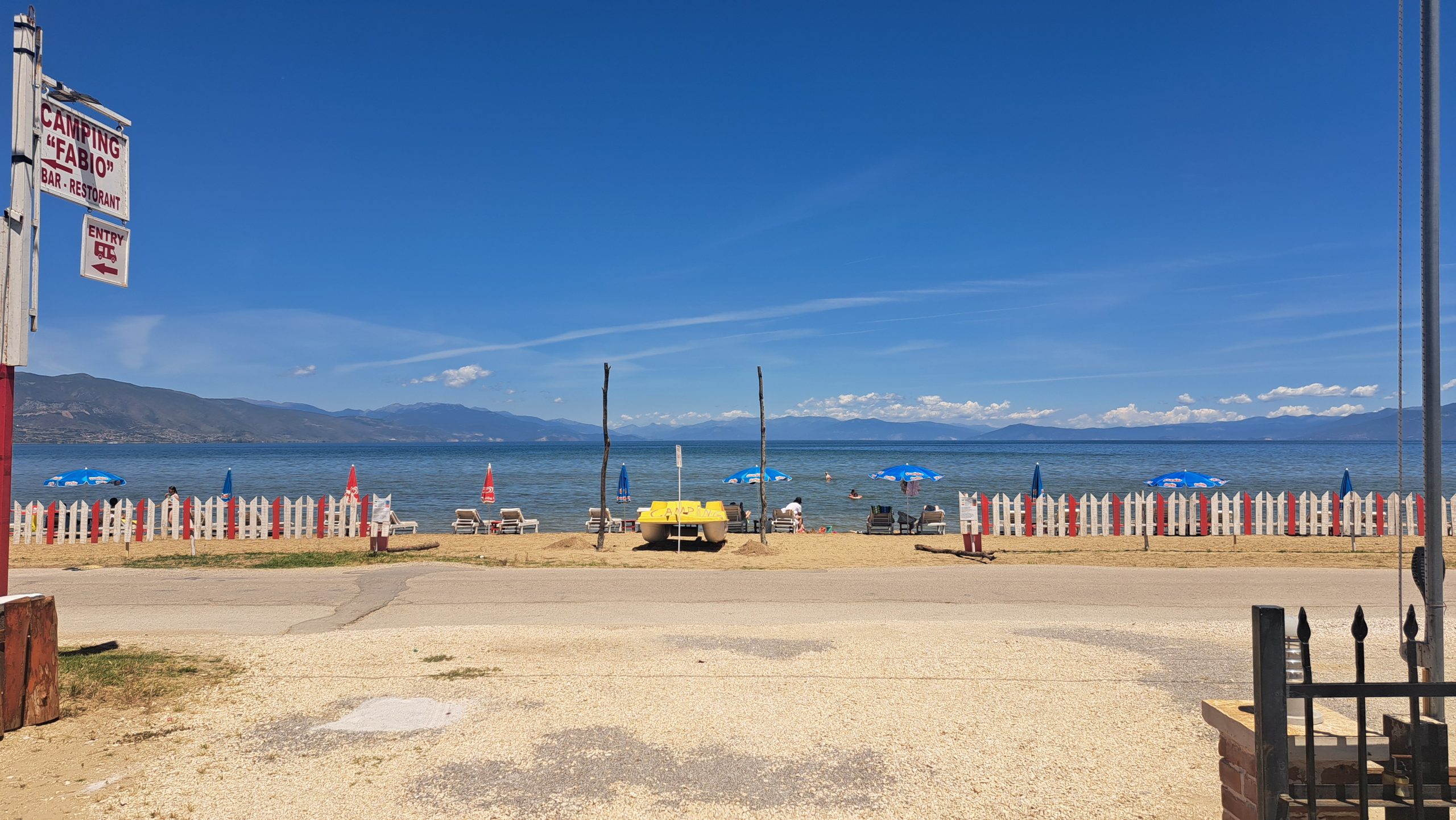 Der CP Fabio ist ein kleiner Platz mit etwa 20 Stellplätzen am Ufer des Ohridsees. Es gibt für Damen und Herren je einen Raum mit einem Waschbecken, einer Toilette und einer Dusche. Sehr einfach gehalten…für 15€ pro Tag inkl. Strandliegen und Sonnenscirm allerdings preiswert. Wir trinken eine Kleinigkeit in der Taverne des Campingplatzes, legen uns anschließend in die Sonne am Strand und schwimmen im recht warmen, flachen Seewasser.