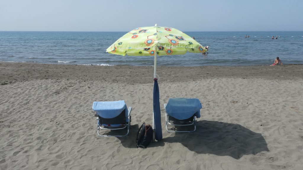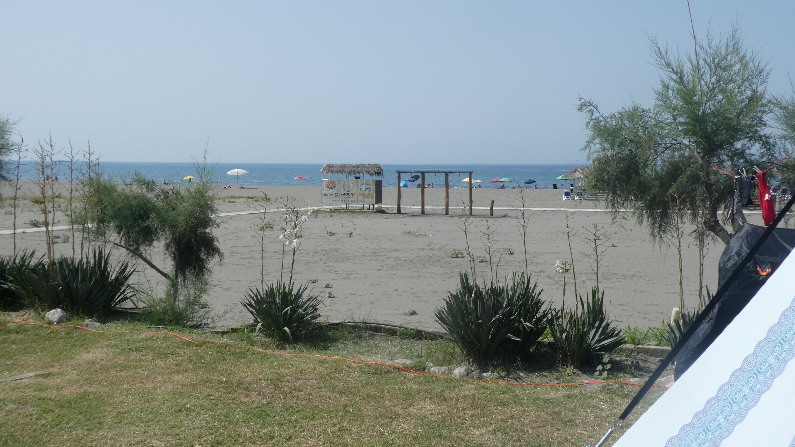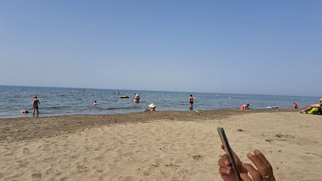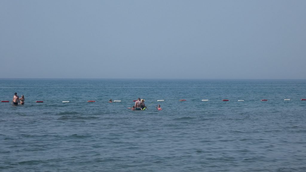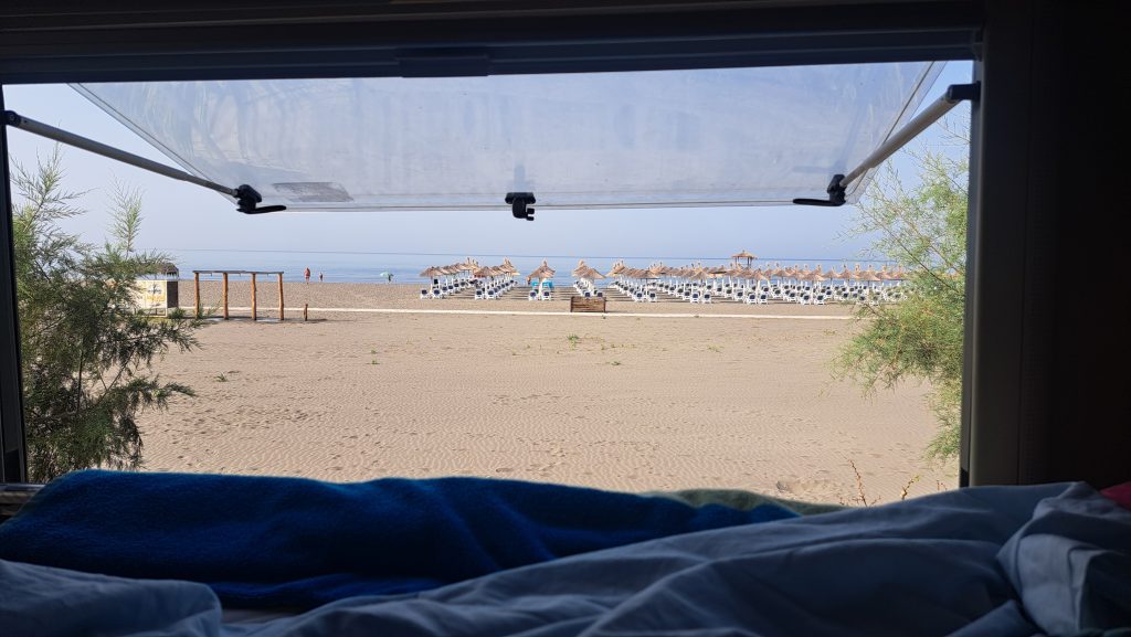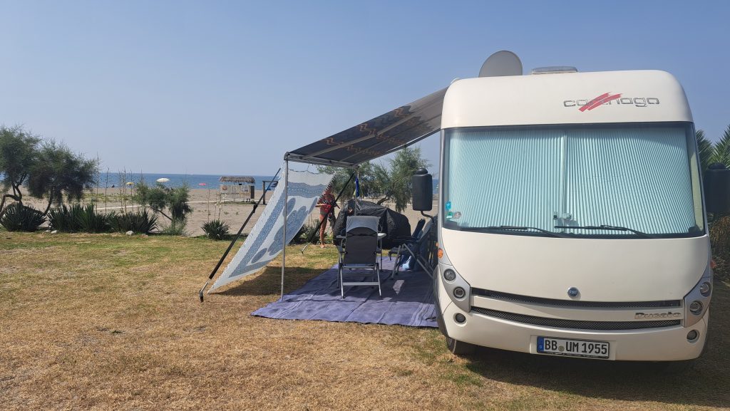 Wir folgen der etwas längeren Route, die wir über Googlemaps errechnet haben, um unserem WoMo die kürzere Fahrt über kurvenreiche, steile Pässe auf schmalen Straßen zu ersparen. Der Verkehr war heftig. Wir hatten einige Staus und die geplante Fahrzeit verlängerte sich um fast eine Stunde. Es hat sich aber gelohnt. Auf dem Campingplatz haben wir wieder den Stellplatz bekommen, den wir im letzten Jahr hatten: direkt am Strand mit Blick auf das Meer. Nachdem alles hergerichtet ist gehen wir schwimmen…das Wasser ist angenehm kühler als in Albanien. So können die Strandtage beginnen!