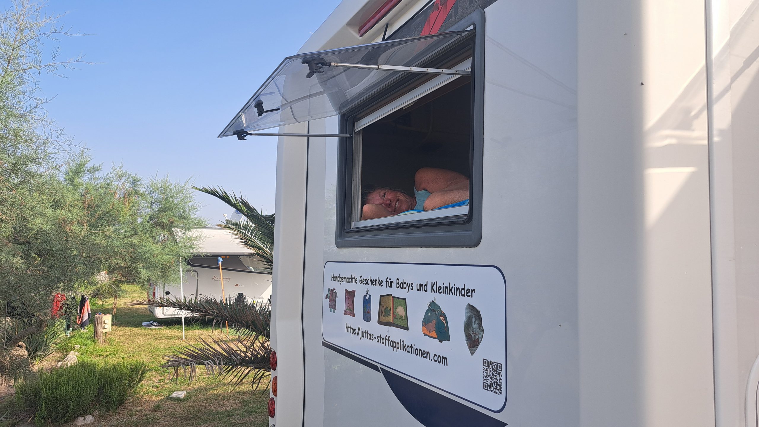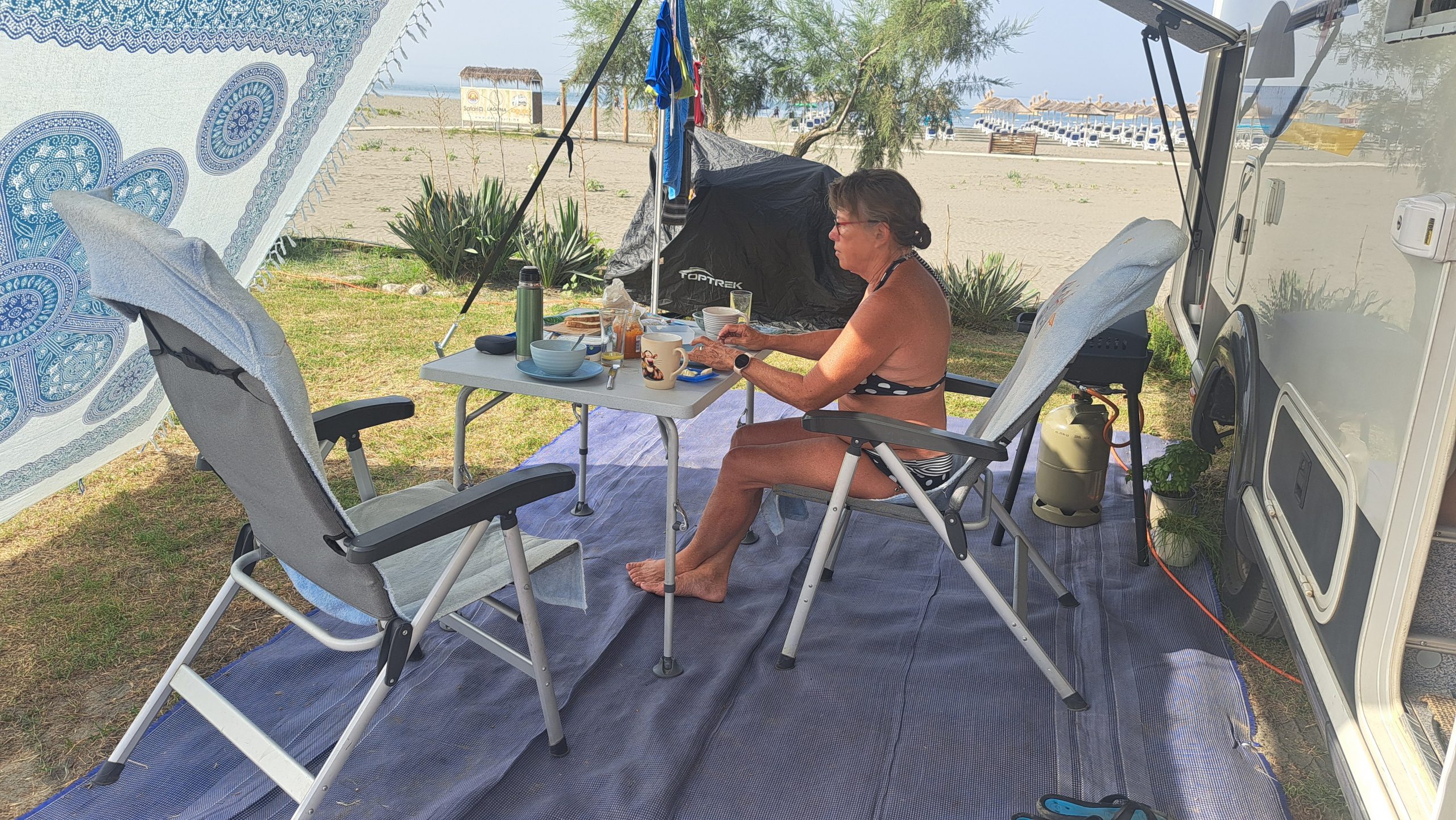 22.Juni 2024:Die Brutzelzeit auf dem Safari CP kann beginnen. Heute früh gehen wir noch vor dem Frühstück schwimmen: 7:00! Wir haben jetzt schon über 20°C. ….und nach dem Frühstück get es dann gleich wieder an den Strand zum Schwimmen und Brutzeln. Im WoMo haben wir die Klimaanlage auf 24°C eingestellt. Das ist bei der derzeitigen Außentemperatur von 31°C eine richtige Abkühlung. Nun ein paar Bilder vom Platz und vom Strand: