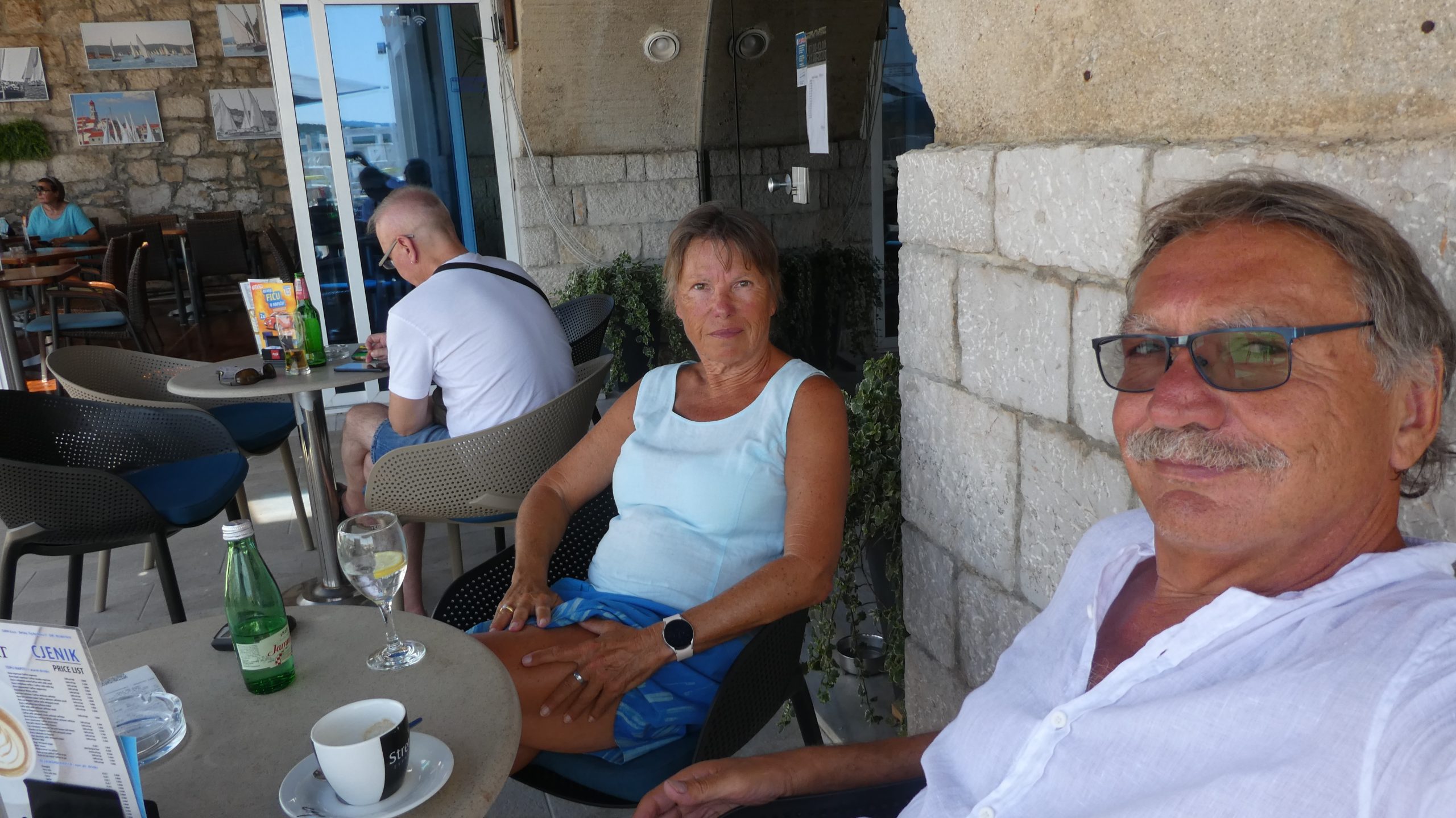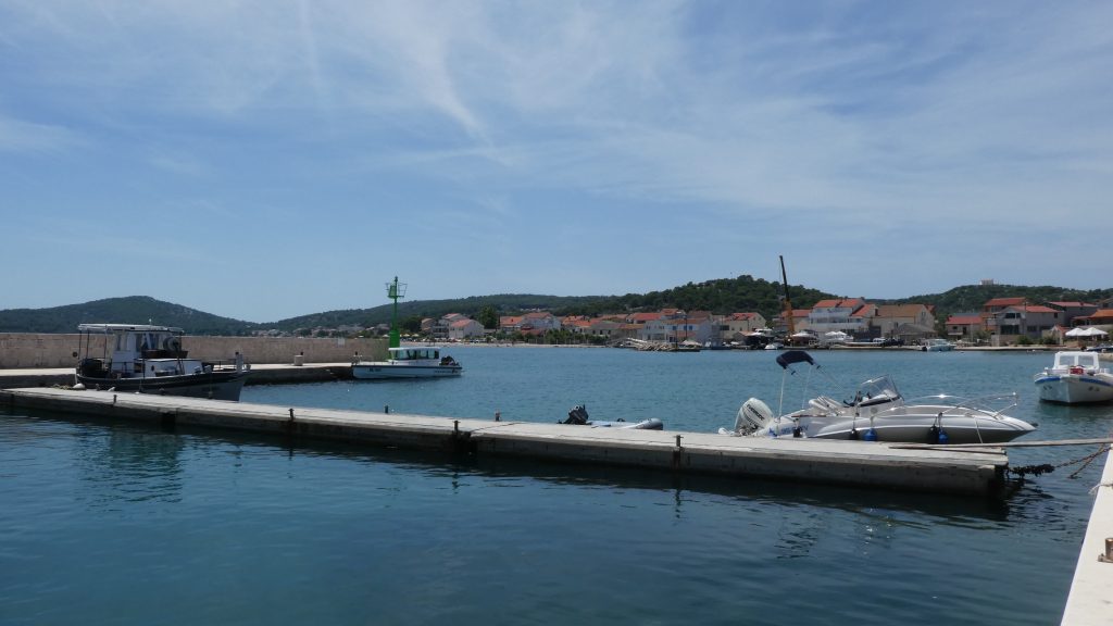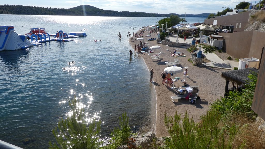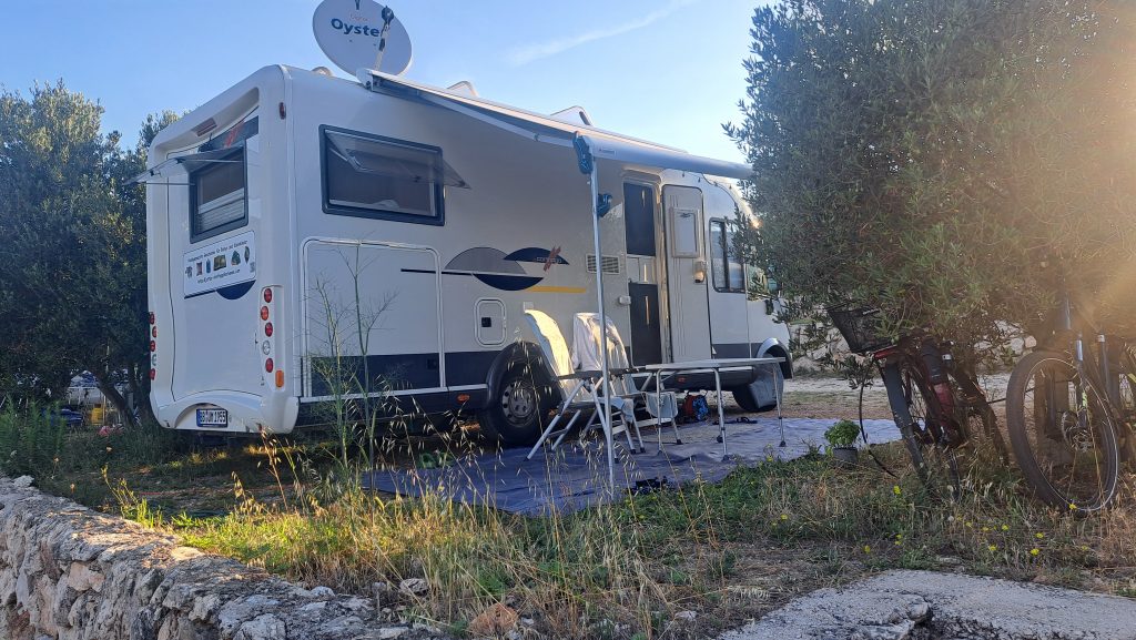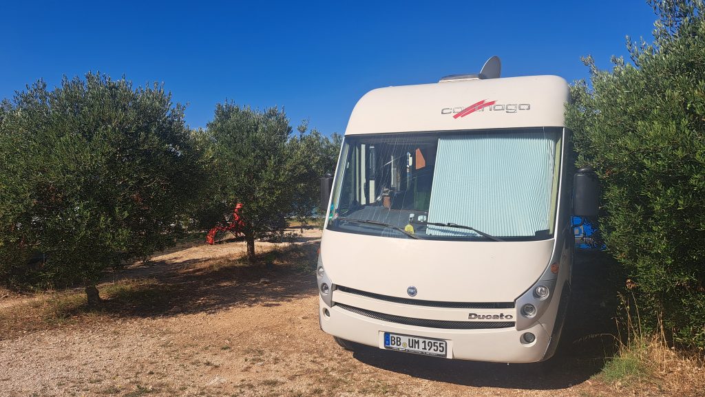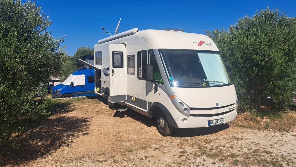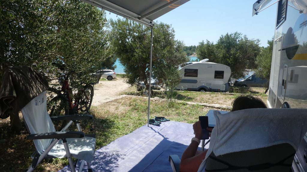 …..und fahren dann über die Autobahn weiter. Von der Abfahrt ‚Sibenik‘ haben wir dann noch gute 45km bis zum Campingplatz vor uns. Gegen 18:30 erreichen wir dann endlich unser Ziel. Für die 477km haben wir mehr als 10 Stunden gebraucht. Auf der Suche nach einem geeigneten Stellplatz treffen wir Bekannte vom letzten Jahr. Sie schlagen uns einen Platz in der ersten Reihe, direkt am Wasser, vor. Ich versuche das WoMo zu platzieren leider ist das Gelände zu uneben und wir entscheiden uns für einen anderen Stellplatz.
