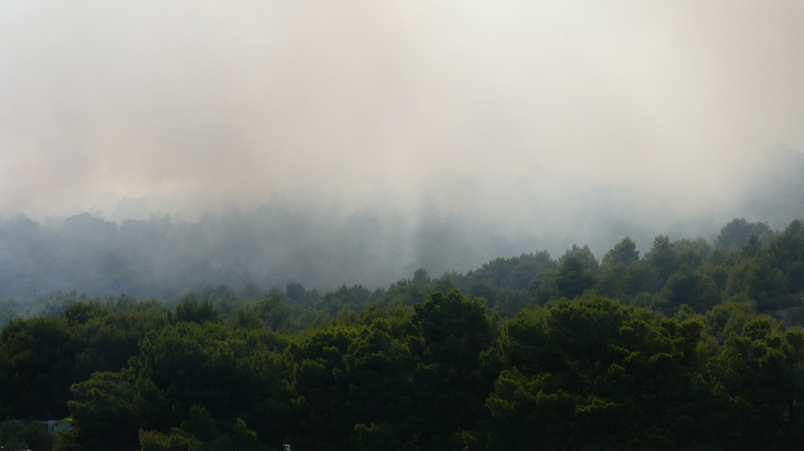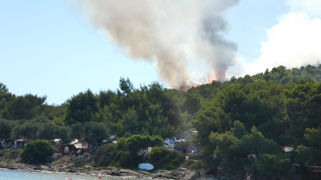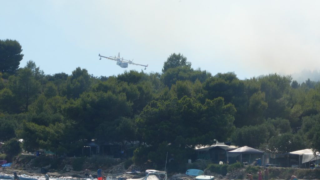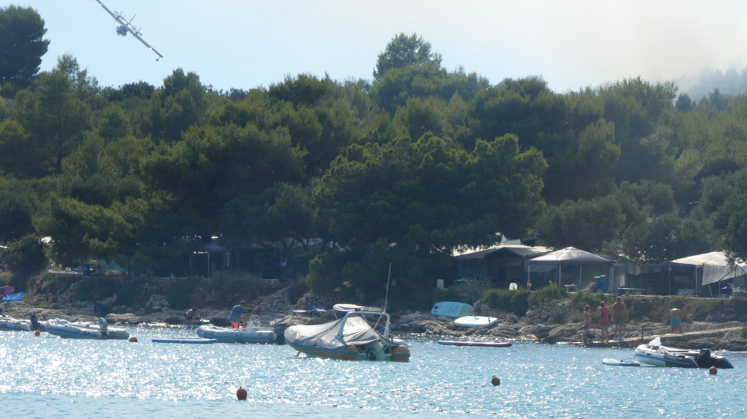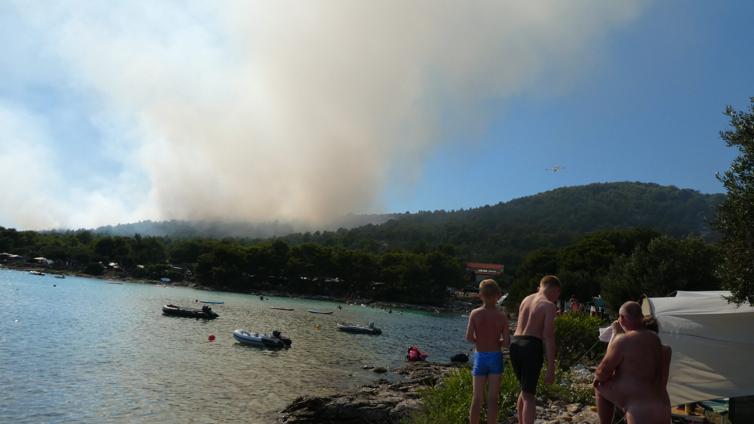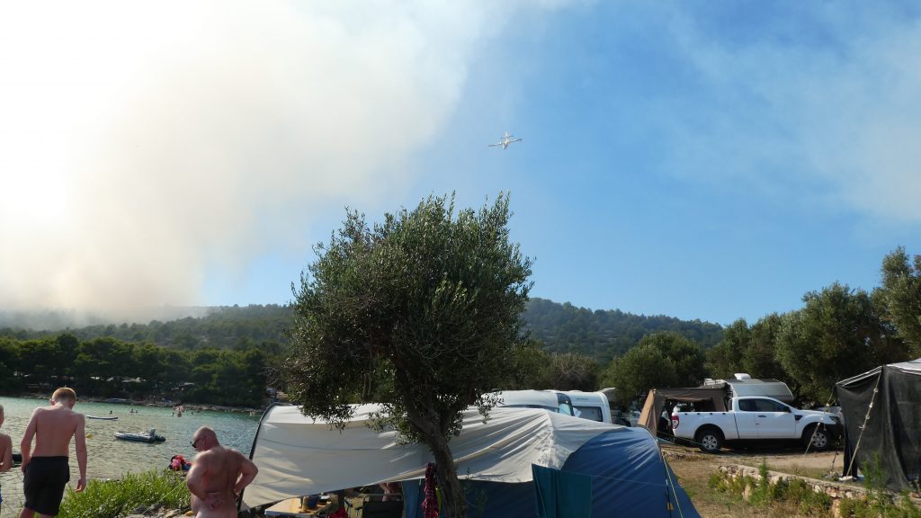 Und zu guter letzt, einen Tag vor unserer Abreise, bricht im nahegelegenen Wald ein Feuer aus. Der Wind steht ungünstig, und die Flammen drohen auf den Campingplatz zu zuwandern. Asche und Rauch haben bereits unser Wohnmobil eingenebelt. Einige Camper paken hastig ihre Sachen und versuchen den Campingplatz über die enge Ausfallstraße zu verlassen. Die Feuerwehr, mit einem Lösch- und einem Tankfahrzeug, ist angesichts der beiden Feuerherde überfordert und ruft Löschflugzeuge zur Hilfe. Innerhalb kurzer Zeit sind vier Flugzeuge im Einsatz, die bis in die Abendstunden Wasser über die Brandstelle ablassen.
