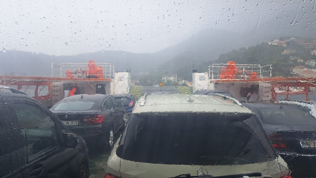 Das Navi hat eine alternative Route an Kotor vorbei mit der Fähre bei strömenden Regen über die Bucht von Kotor vorgeschlagen. Wir folgen ihr.