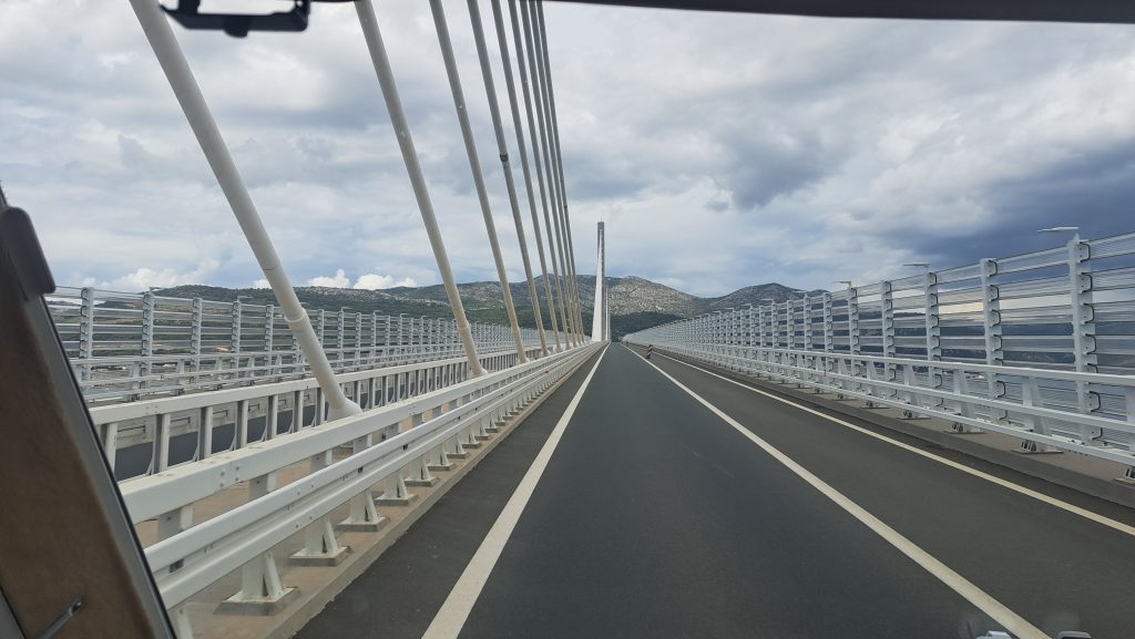 Über den Grenzübergang unweit der Stadt Herzeg Novi fahren wir über Grenze nach Kroatien in Richtung Dubrovnik. An Dubrovnik vorbei geht es über die neue, von der EU finanzierten Franjo Trutman Brücke…sehr beeindruckend.