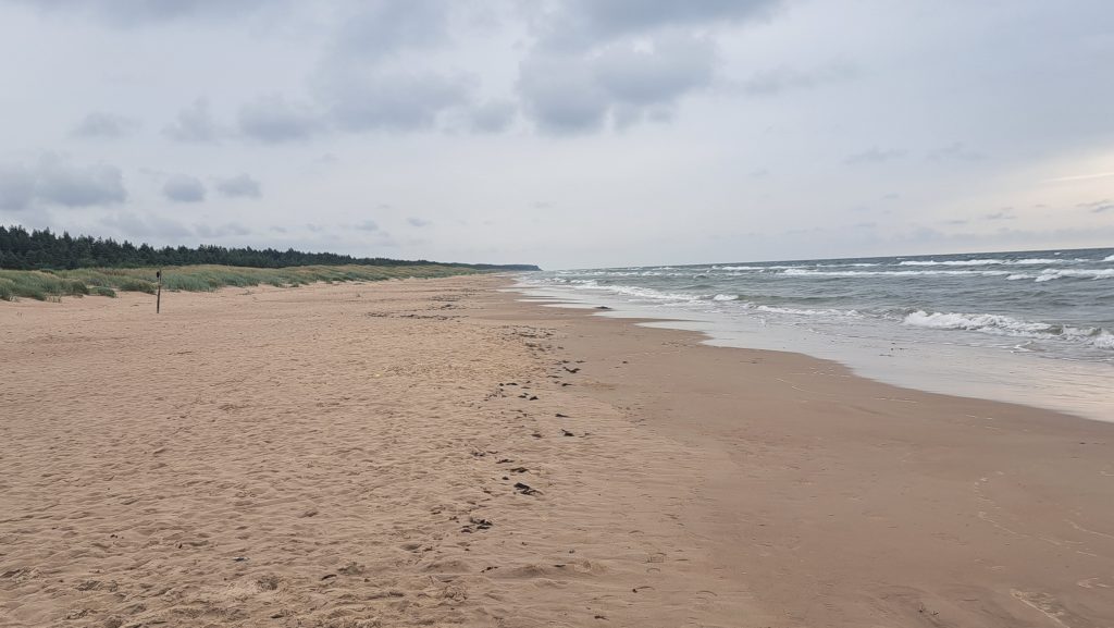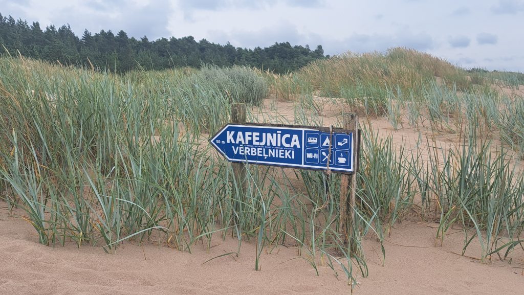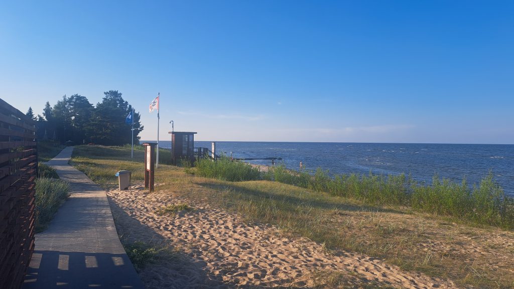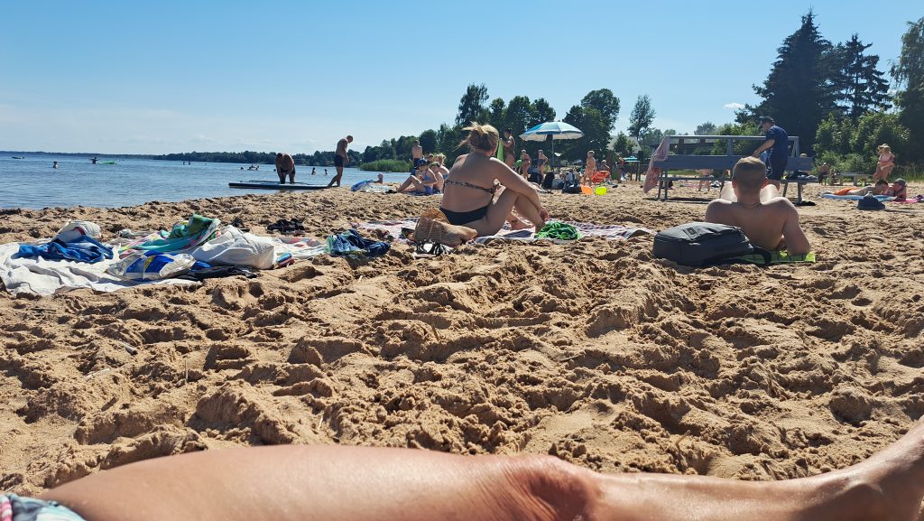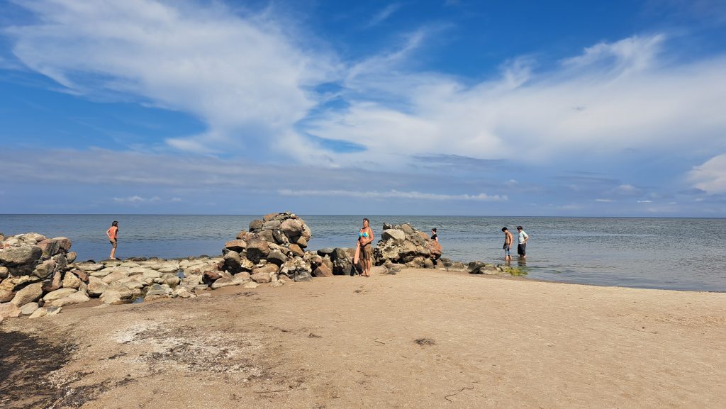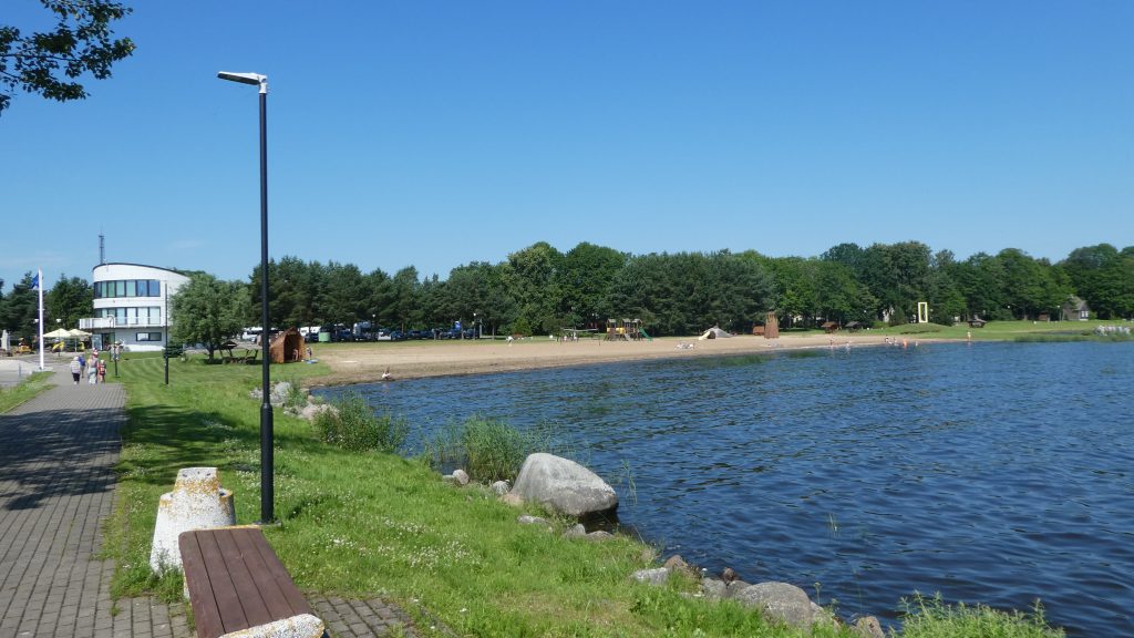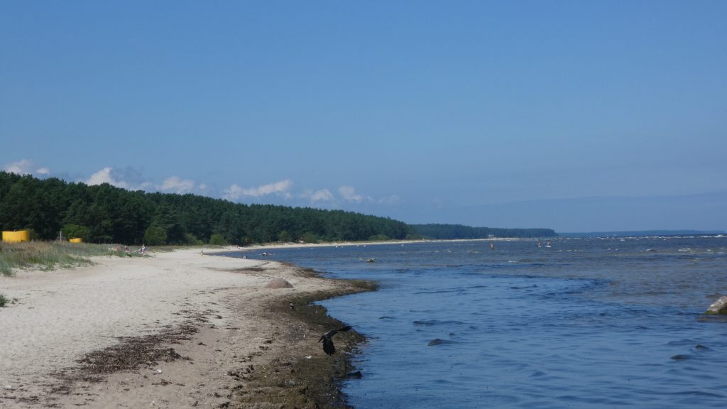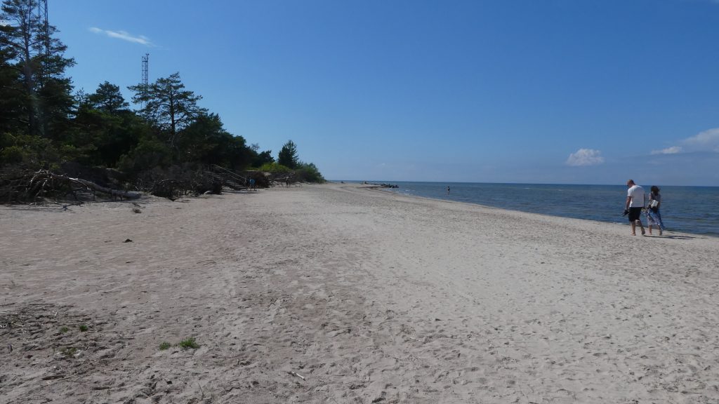 Der Strand am Campingplatz ist gepflegt und wird von angespültem Seegras befreit. Das Wasser ist extrem flach… man muss etwa 300m über mehrere Sandbänke laufen, um einigermaßen schwimmen zu können. Das haben wir allerdings bei allen Stränden in der Bucht von Riga so gehabt. Wir machen einen Strandspaziergang nach Engure, das ca 4km entfernt liegt. Der Ort hat nicht viel zu bieten und wir gehen zurück.
