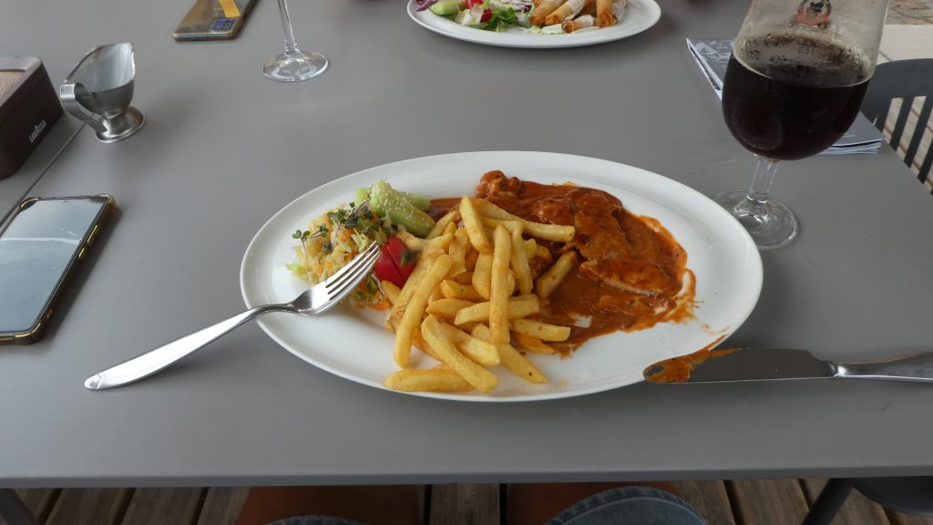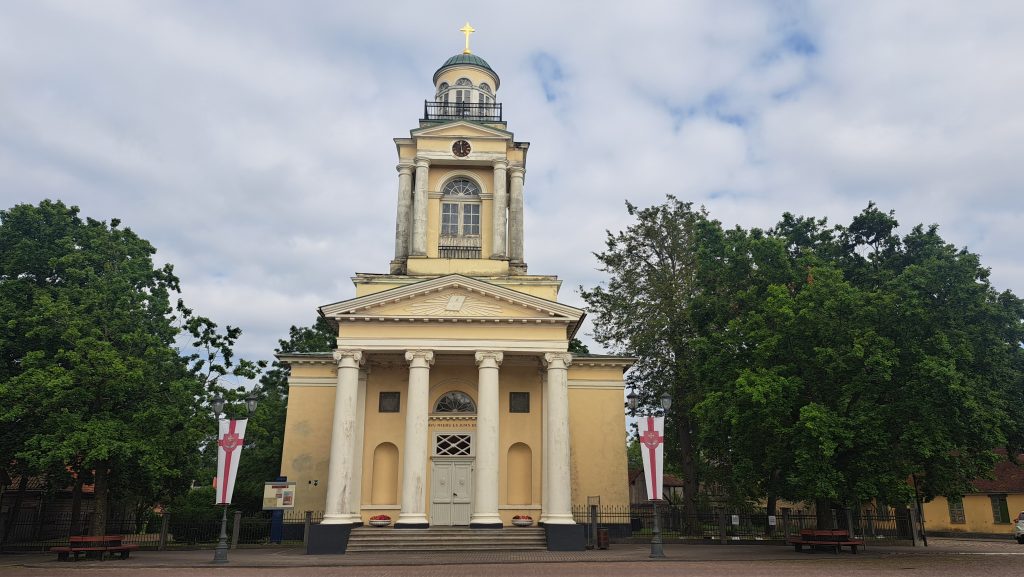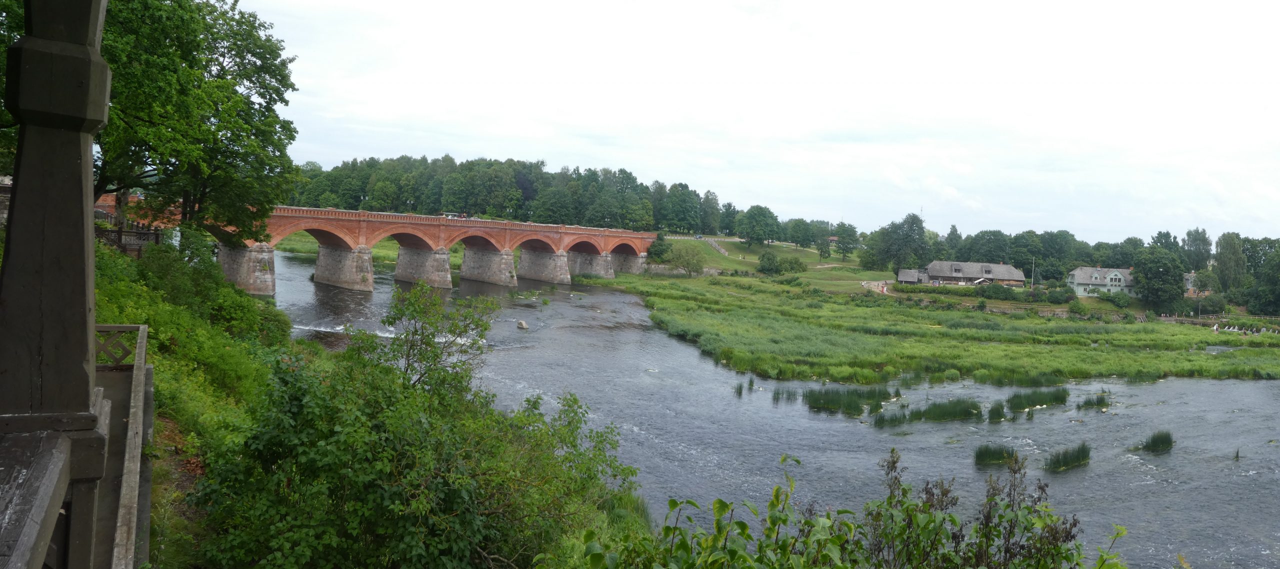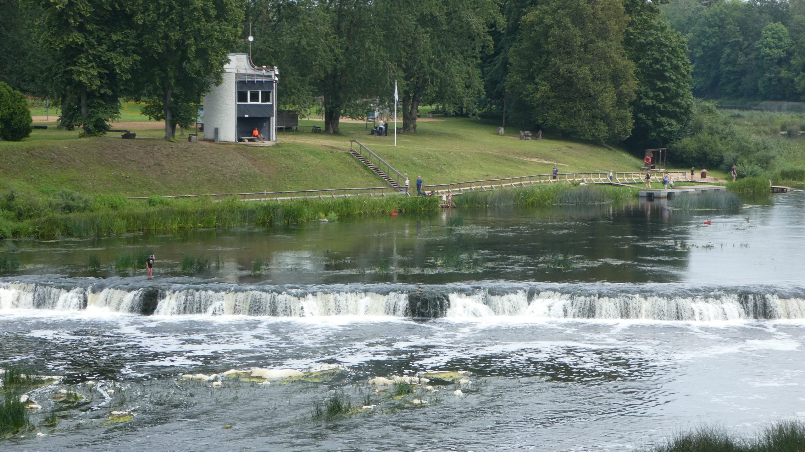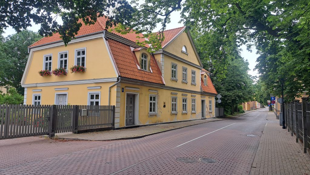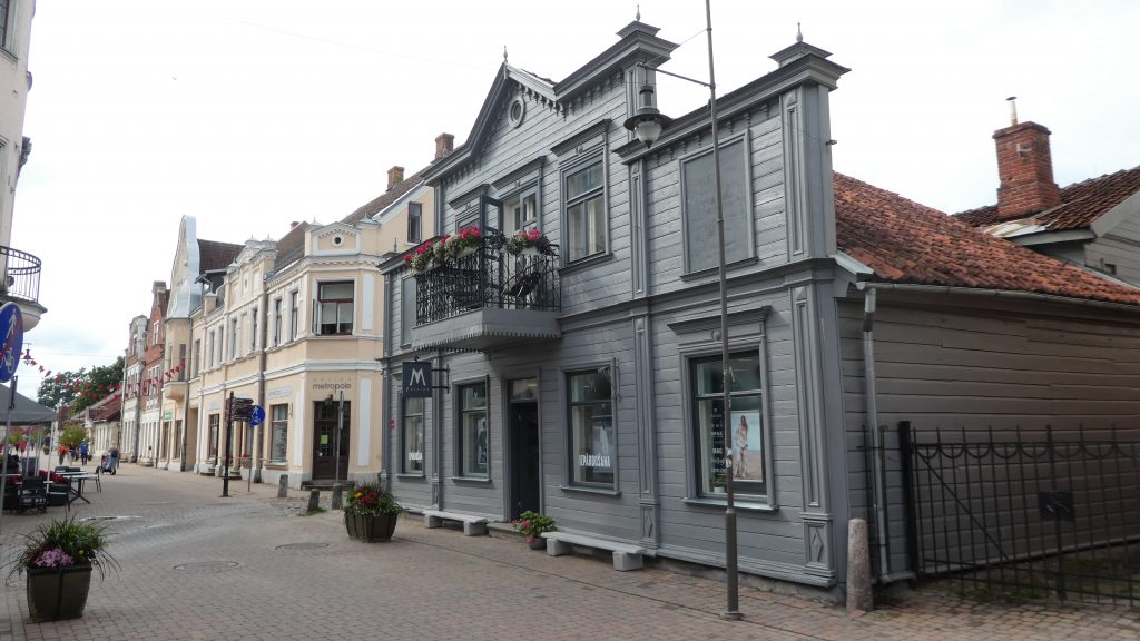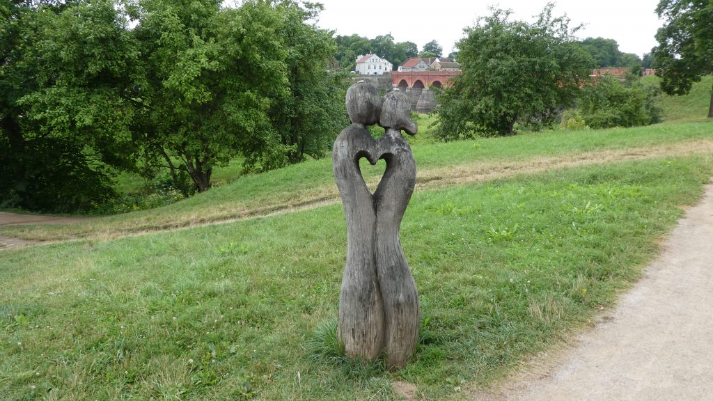 Kuldiga ist bekannt für den breitesten Wasserfall Europas. Das Wasser der Venta rauscht dort im Sommer über eine Breite von 150m über die 2m hohen Klippen. Im Frühjahr und Herbst weitet sich der Fluß bis auf 275m Breite aus. Im Frühjahr versuchen Fische den Wasserfall zu überwinden, um in ihre Laichgebiete zu kommen. Das nutzen Fischer früher aus und fingen die Fische in der Luft mit Körben auf. Heute sieht man mit Glück Störche, die versuchen, die ‚fliegenden Fische‘ in der Luft zu fangen. Wir stellen unser WoMo auf einem Parkplatz in der Innenstadt ab und erkunden Kuldiga zu Fuß. Wie in vielen baltischen Staaten haben Deutsche auch hier ihre Spuren hinterlassen. Architekten haben in Kuldiga Gebäude bauen lassen und reiche Händler haben sich hier niedergelassen. In den gepflegten Parks, die wir auch in fast allen baltischen Städten finden, stehen Kunstwerke aus Stein und Holz. Die Häuser der Stadt sind reichlich verziert. In der Einkaufsstraße gibt es sehr gut erhaltene und restaurierte Häuser. Bevor zum WoMo zurück gehen um einen geeigneten Parkplatz für die Nacht zu suchen, kehren wir in ein traditionelles Gasthaus direkt neben der Touristinformation ein und essen zu Abend.