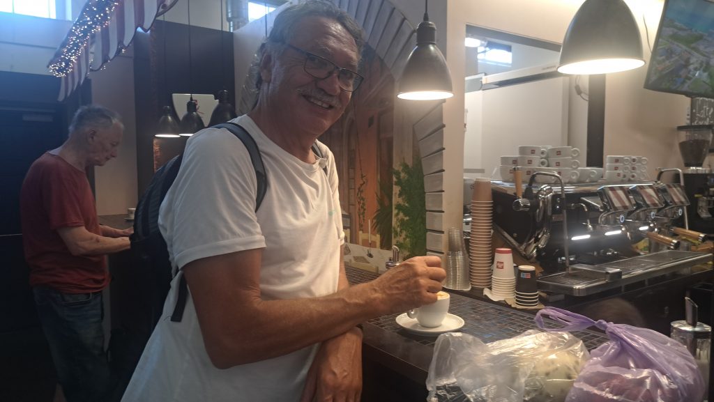 Unser nächster Stopp ist ein vielbesuchter Badestrand in Kalastre, etwa 30km weiter am See entlang. Hier gibt es einen Sandstrand mit seichten Wasser. Die beiden Dixi Toiletten sind, wie nicht anders zu erwarten, sauber. Nachdem die Tagesbesucher abgefahren sind und wir unseren Strandaufenthalt beendet haben, ergattern wir ein schönes, schattigen Plätzchen für unser Wohnmobil. Außer uns ist ein weiteres deutsches Paar mit einem Bulli-Camper, zwei holländische Frauen mit einem Kastenwagen und Einheimische mit einem Wohnwagen an dem Platz. Gegen Abend kommen weitere Wohnmobile, die teilweise wieder abfahren, da der Platz nicht mehr ausreicht.