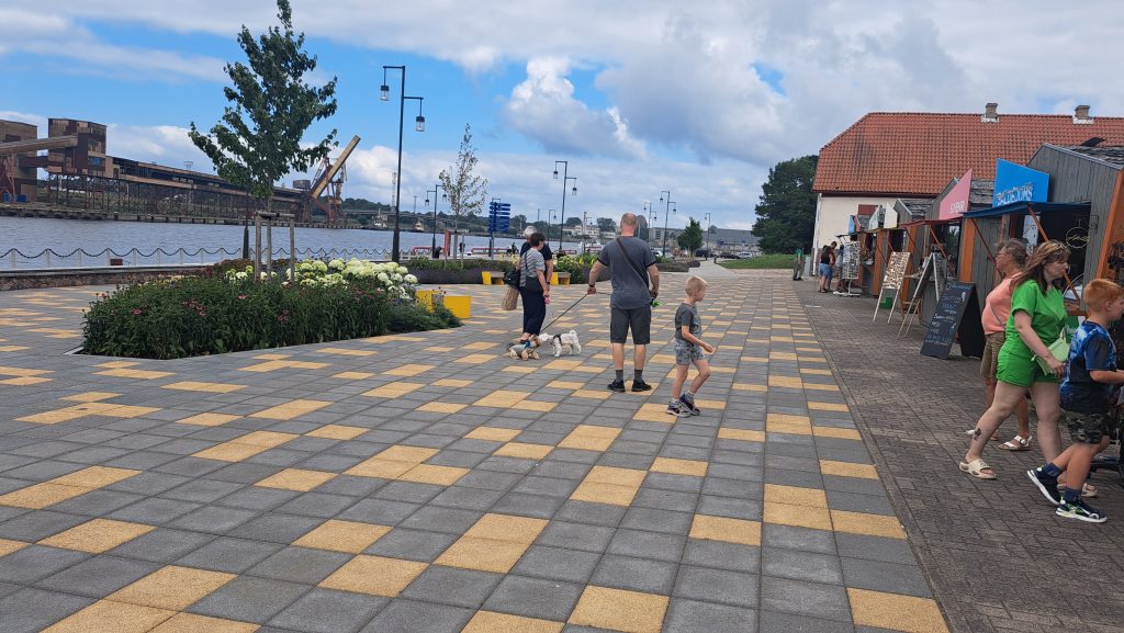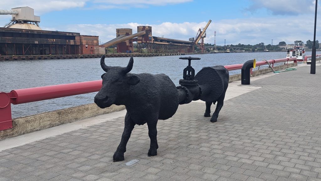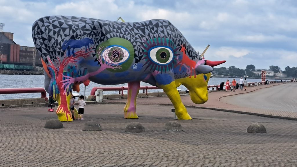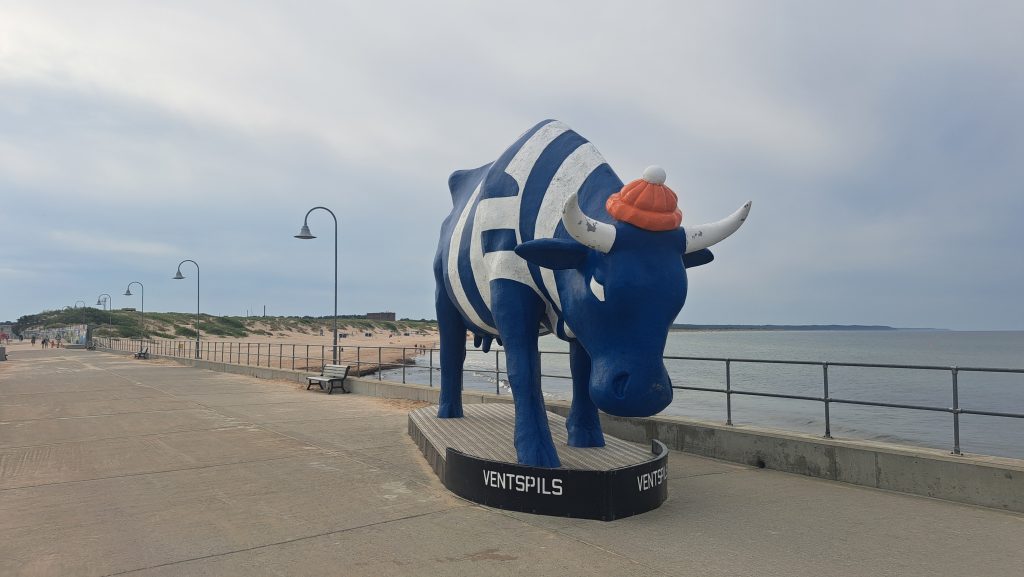 27.Juli 2025 Das Rückreisedatum kommt näher! Nach dem Frühschwimmen in der Ostsee und einem ausgiebigen Frühstück fahren wir in das ca 85km entfernte Ventspils. Unser Stellplatz befindet sich ca 10 Gehminuten vom Strand entfernt. Gegen Mittag erreichen wir Ventspils, kaufen noch ein paar Lebensmittel im örtlichen Supermarkt und bei Lidl ein, bevor wir unser Wohnmobil auf einem Parkplatz nahe des Strand abstellen. Wir gehen an den unerwartet leeren Strand und nehmen ein erfrischendes Bad in der Ostsee. Anschließend erkunden wir die Stadt. Vor einigen Jahren wurden hier unterschiedlich farbige Kühe verschiedener Größe als Skulpturen aufgestellt, versteigert und der Erlös einem guten Zweck zugeführt. Der Eindruck von der Stadt ist zweideutig: gepflegt, sauber, modern bzw restauriert auf der einen Seite und zerfallen und verlassen auf der anderen. Alles in Allem hat sich der Besuch aber gelohnt.