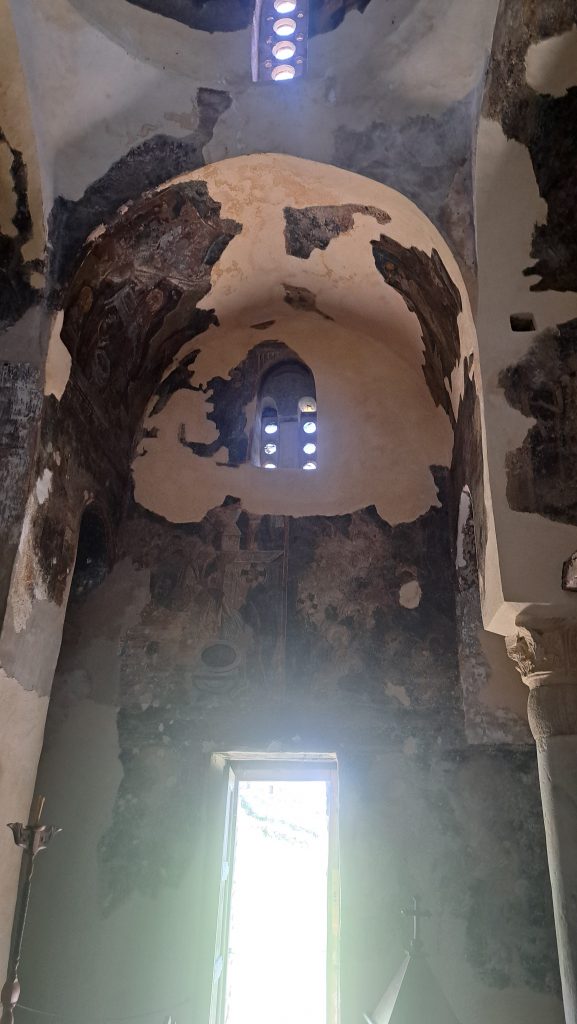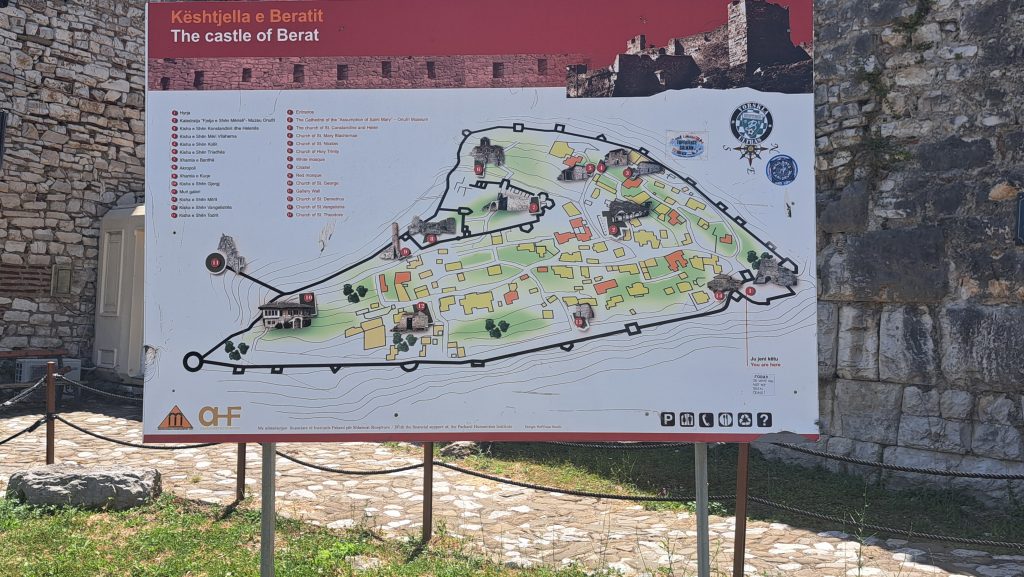 7.Juni 2024: heute besuchen wir die Burgruine Kështjella e Beratit oberhalb von Berat. Es ist 10:00. Ein 40 minütiger Aufstieg bei über 30°C steht uns bevor. Wir nehmen nicht den ausgeschilderten Weg über die glatt geschliffenen Marmorsteine, sondern wählen einen Schotterweg, der vom Kreisverkehr inmitten der Stadt in Serpentinen vorbei an alten, teils verfallenen, aber noch bewohnten Häusern bis hinauf zur Burg führt. Neben dem Vorteil, dass wir nicht über den glatten Marmor laufen müssen, säumen hier auch schattenspendende Bäume den Weg. Heute wird für den Besuch der Burg kein Eintritt verlangt. Ein Großteil der Burg ist von Restaurants genutzt. Auch einige Anwohner gibt es hier oben, die in teils guten aber auch baufälligen Gebäuden der Burg leben. Daneben existieren noch einige funktionsfähige Kirchen. In einer der Kirchen wurde ein orthodoxer Gottesdienst vorbereitet, den ich allerdings nicht fotografieren wollte. Hier sind nun ein paar Fotos von unserem Ausflug.