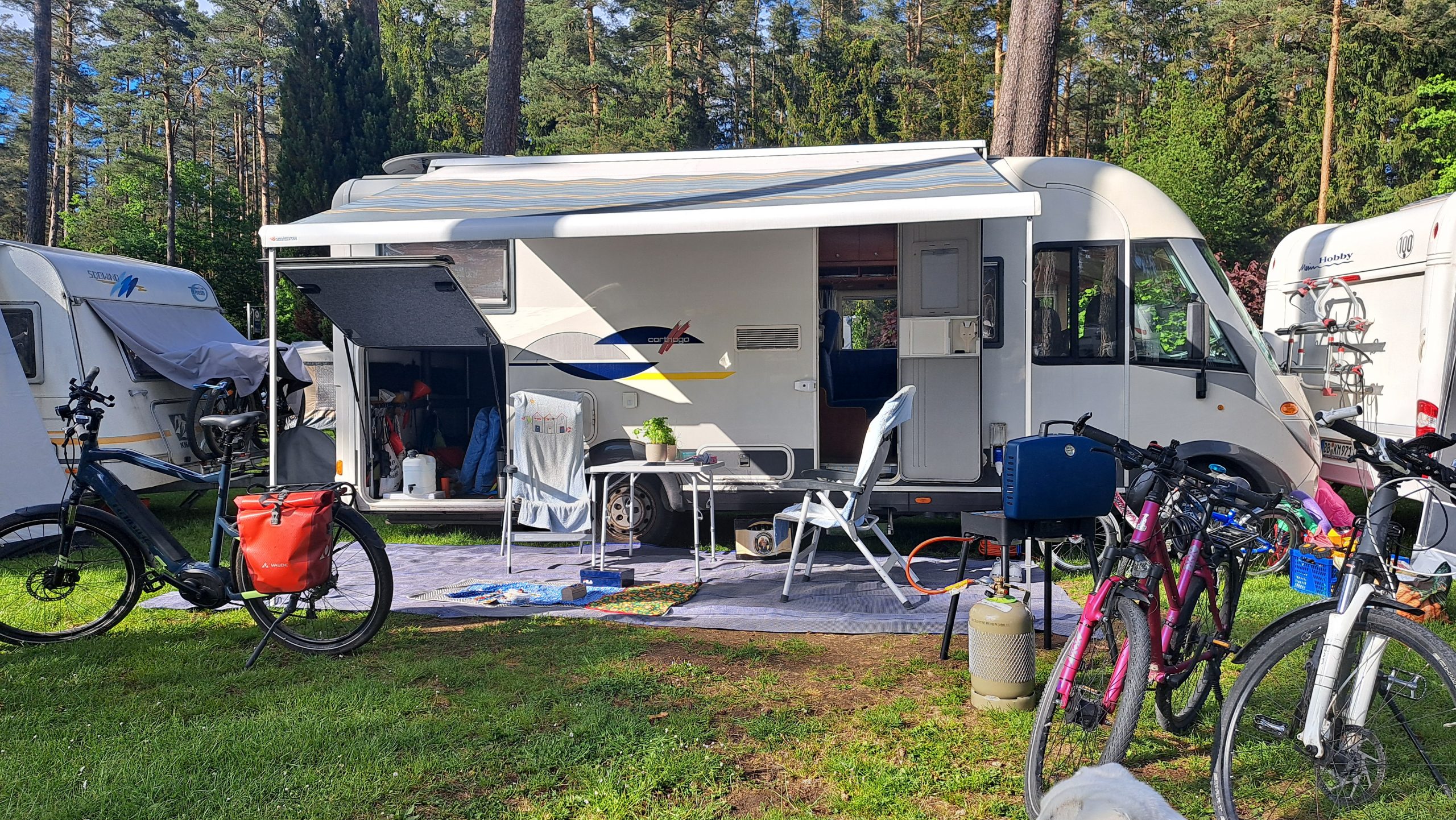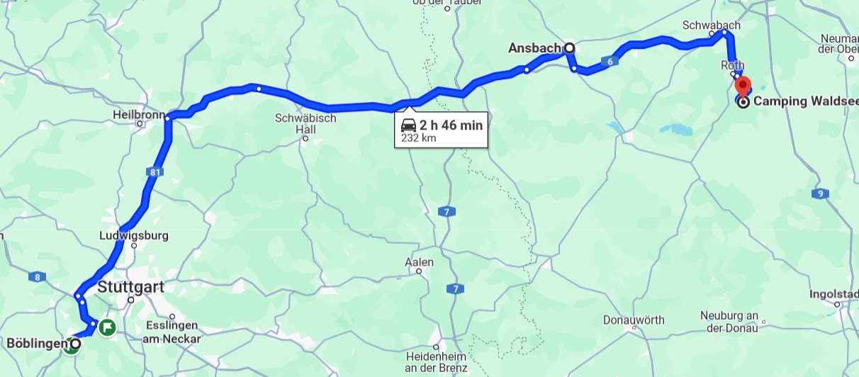 Gegen 14:30 waren die 240km geschafft und wir konnten den Platz um 15 Uhr belegen. Wir sind auf einem kleinen schnuckeligen Campingplatz an einem See in der Nähe von Roth gelandet. Eigentlich wollten wir an den Brombachsee… nun sind wir hier und genießen die erste Pfingstwoche.