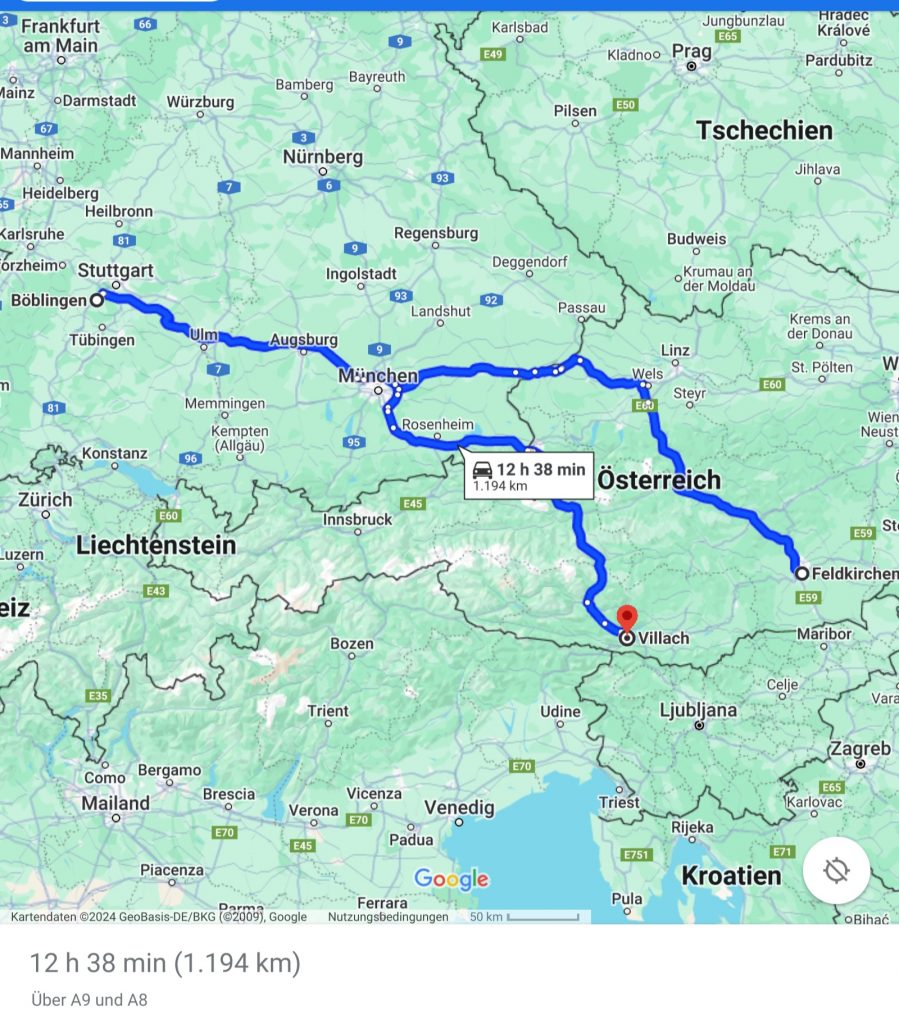 27./28.05.2024 – 10:00: Anruf bei der Zulassungsstelle in Böblingen…mit dem Ergebnis, daß wir zurück nach Böblingen mussten, um einen neuen Schein zu bekommen. Also… Abfahrt nach Böblingen…Termin vereinbart und am 28.5.24 um 9:45 einen neuen Fahrzeugschein von der Zulassungsstelle geholt. Anschließend wieder auf den Weg in den Urlaub gemacht. Diesmal sind wir bis nach Villach an die Slowenische Grenze gefahren. Zu dieser Fahrt und dem Stellplatz in Villach (Italienerstr. 31) habe ich keine Fotos. Der von Park4Night vorgeschlagene Parkplatz ist für WoMos über 6m zu klein. Ab 6:00 beginnt der Berufsverkehr und es wird laut….dafür ist der P kostenlos! Noch einmal würde wir dort nicht übernachten.