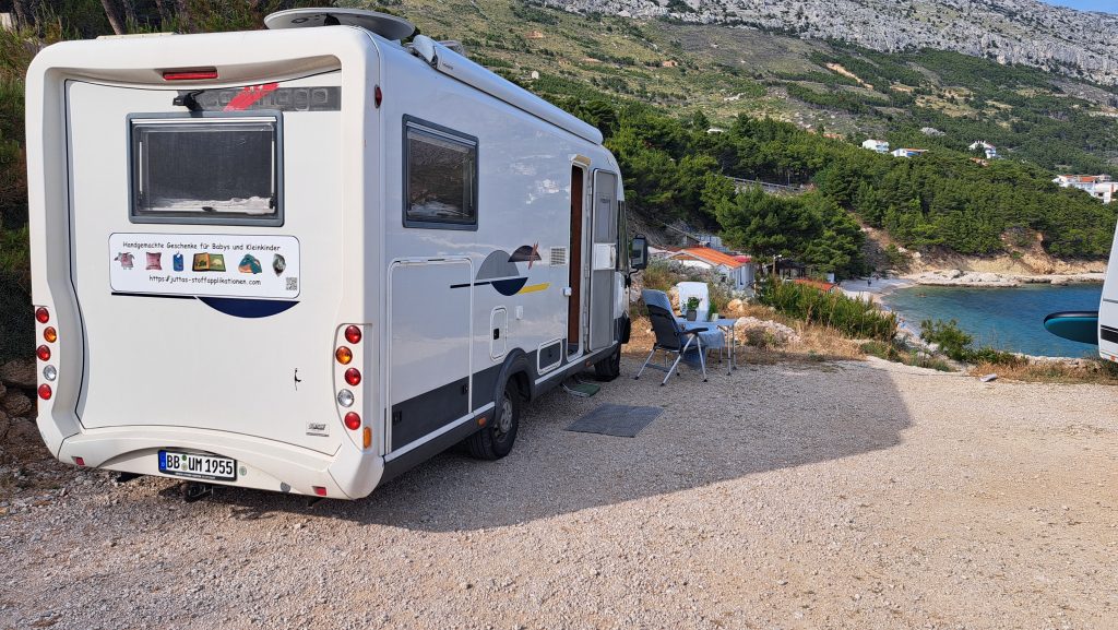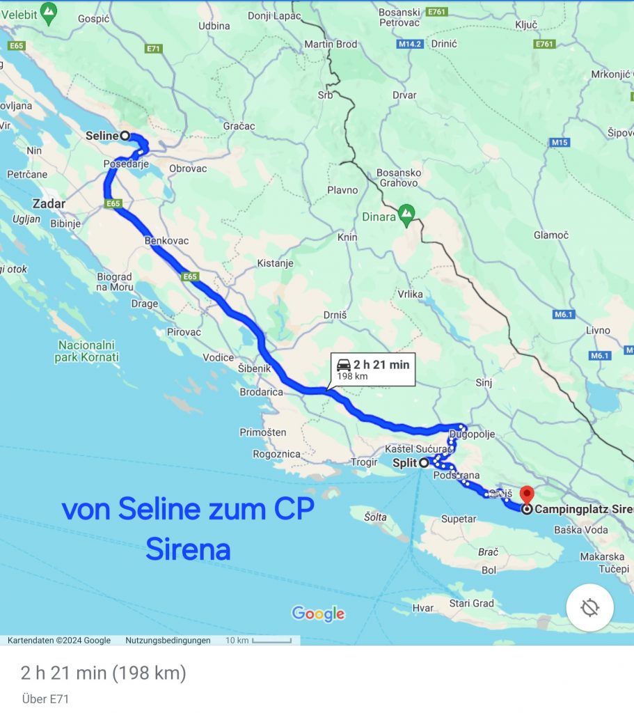 Wie das Bild vom WoMo Parkplatz unten zeigt, ist es dort nicht wirklich schön. So beschliessen wir die Altstadt zu erkunden um dann weiterzufahren. Etwa 30 km hinter Split haben wir einen netten Campingplatz gefunden: Autocamp Sirena. Hier werden wir zwei Nächte bleiben.